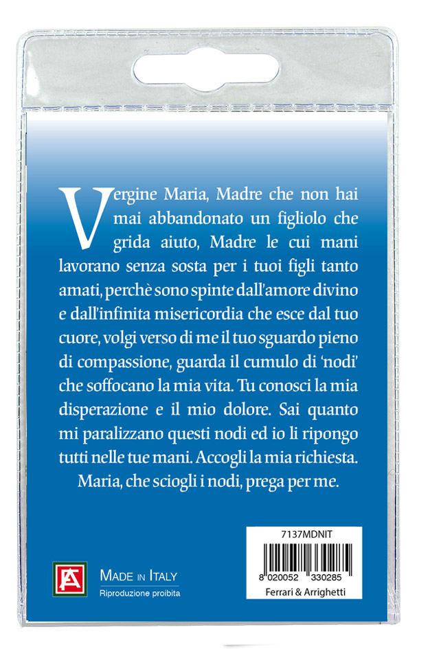La medaglia, in metallo nichelato, ha un cordino in stoffa e su di essa vi è la resina raffigurante Maria che scioglie i nodi. La medaglia misura 2,5 centimetri e verrà consegnata in un blister. All'interno del blister c'è un cartoncino rappresentante Maria che scioglie i nodi, e sul retro vi è stampata una preghiera dedicata a lei.
