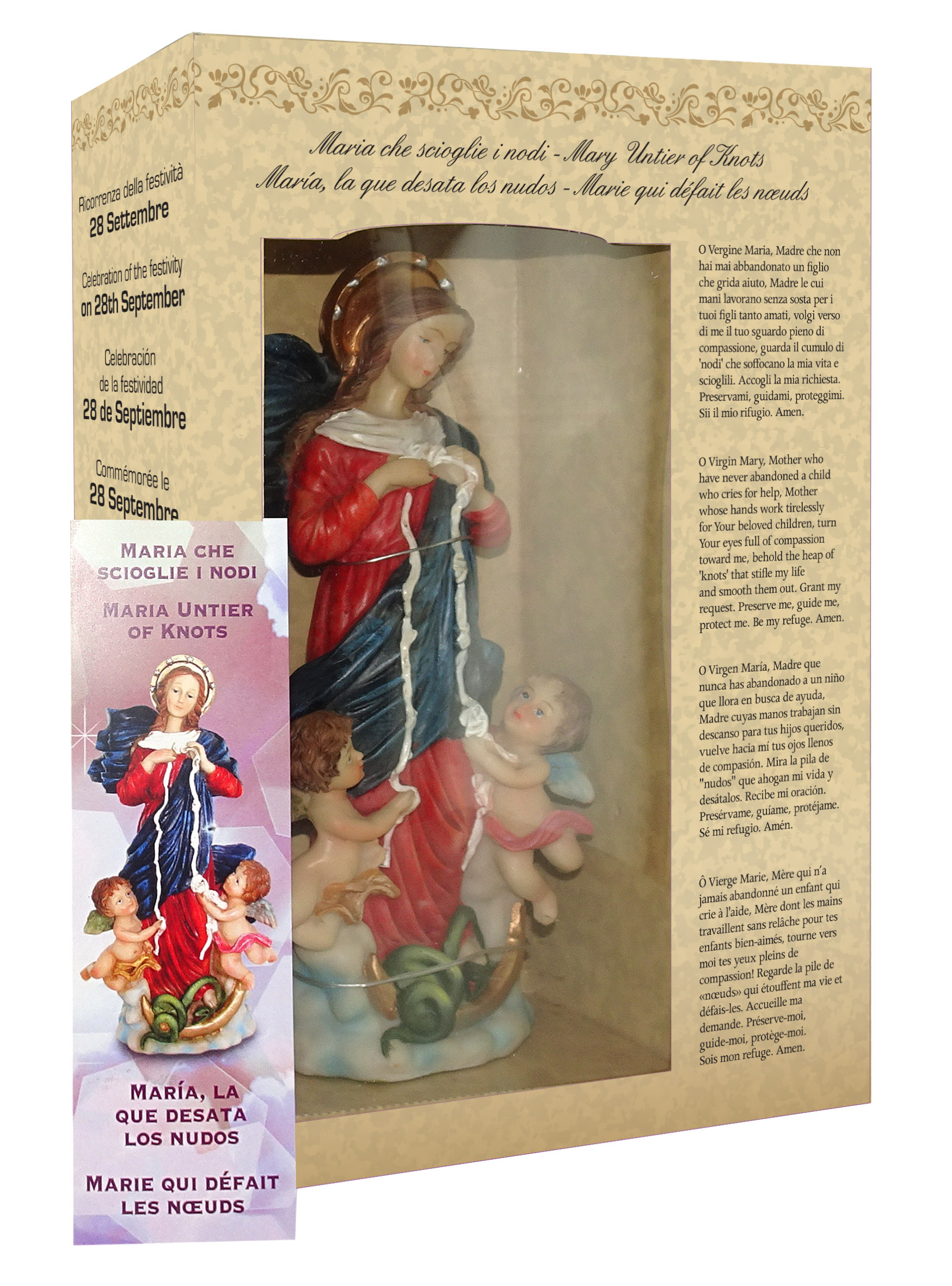 Il prodotto è racchiuso in una raffinata confezione regalo di cartoncino liscio marrone chiaro, molto resistente e dotata di una parte in plastica che, come una vetrina, permette di ammirarne il contenuto. La parte frontale della scatola riporta la stessa preghiera che trovate sul segnalibro, mentre sugli altri lati si può leggere, sempre nelle quattro lingue sopra citate, qualche cenno relativo alla storia della Santa Madre e il giorno della sua celebrazione (28 settembre). La cura dei dettagli e la maestria nella colorazione delle vesti e delle rifiniture, nonché l'eleganza della scatola, rendono questa piccola statua di Maria che scioglie i nodi una gradita idea regalo.