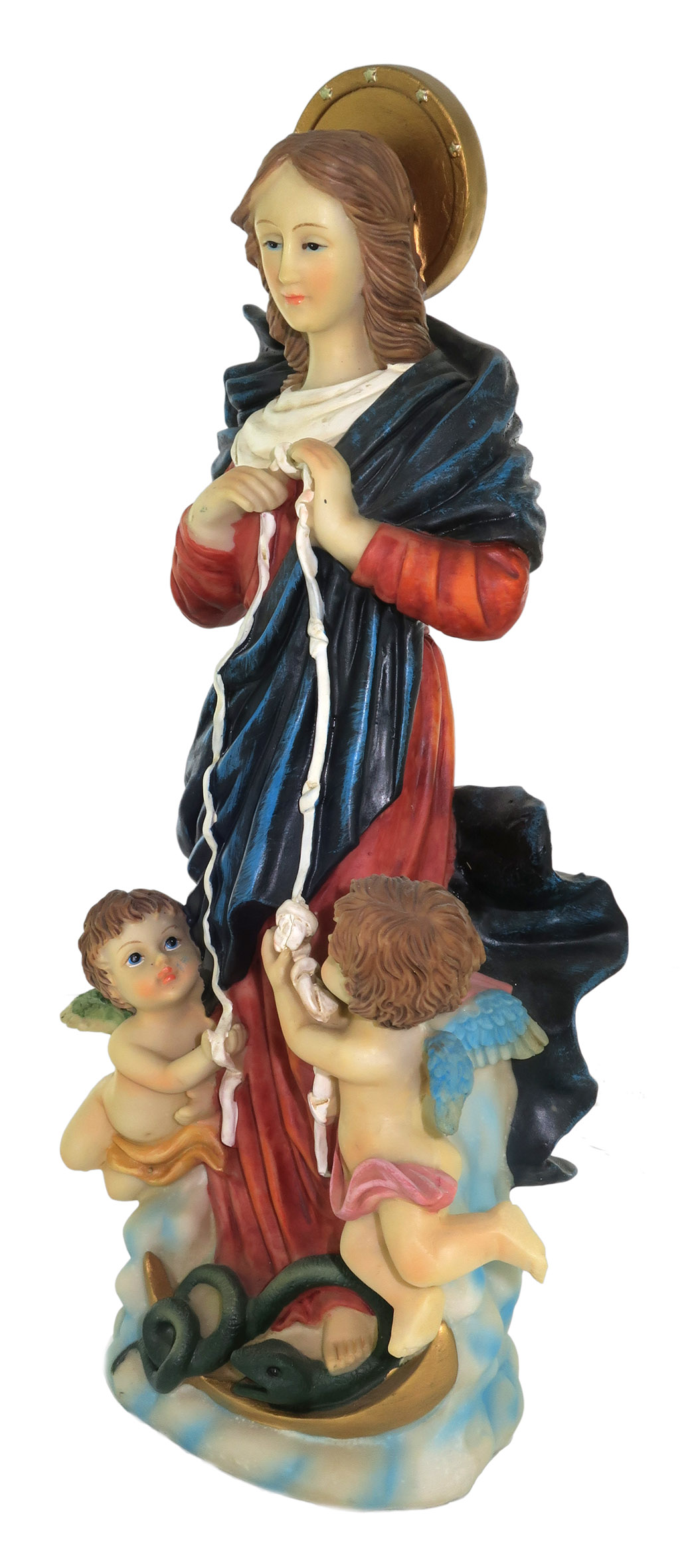 La statua, in resina finemente dipinta a mano, raffigura Maria che scioglie i nodi, posizionata su una piccola base che ricorda le nuvole. La Vergine è intenta a sbrigliare una corda, insieme a due angioletti e una serpe ai suoi piedi. Figura particolarmente cara a Papa Francesco, che vide a Ingolstadt e ne diffuse la devozione a partire da Buenos Aires, indossa vesti eleganti nei toni del rosso chiaro e del blu scuro. In questa statua da 30 cm della Vergine Maria, i nodi simboleggiano le problematiche della vita da risolvere anche con il supporto della fede.