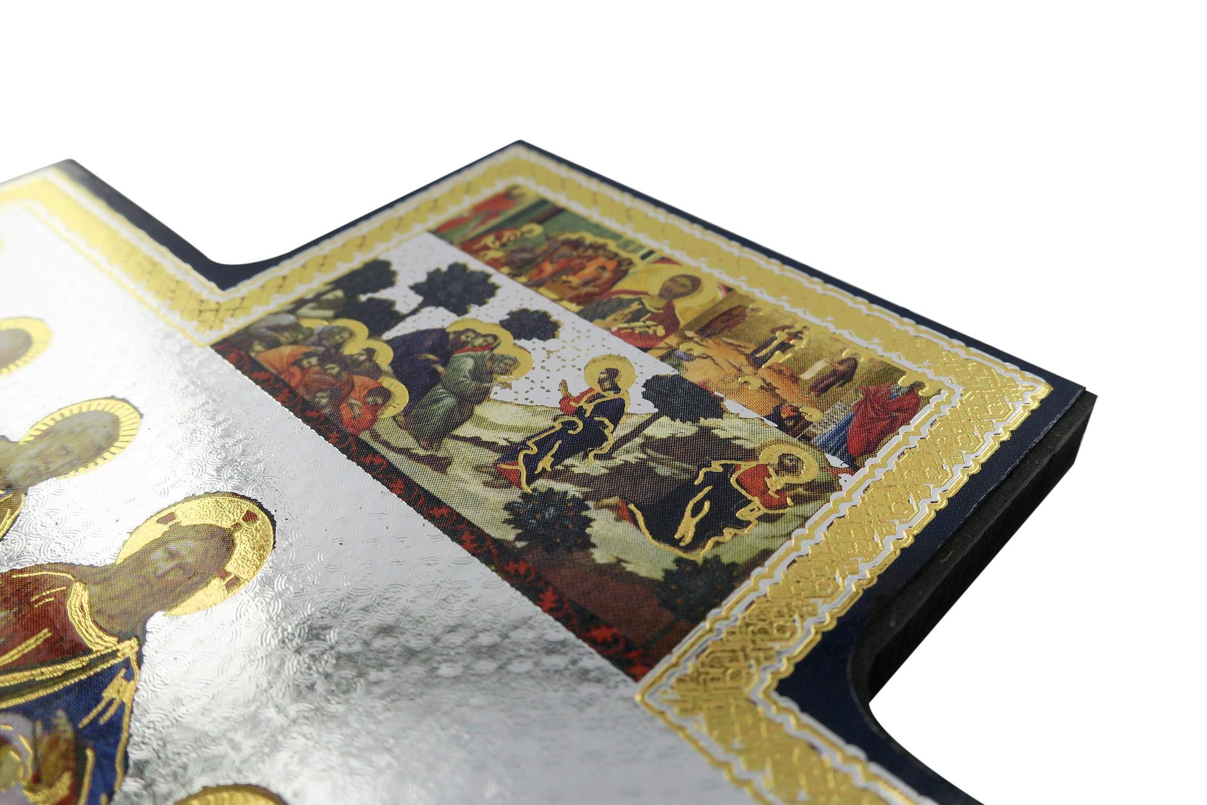 L'immagine è una stampa di carta lucida su croce in legno, con finiture a caldo in oro e in argento.