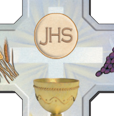 Croce in mdf con l'immagine dei simboli della prima comunione:il calice ,l'uva,le spighe.
