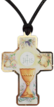 Croce in legno mdf raffigurante i simboli della Prima Comunione con cartoncino che ricorda questo sacramento.