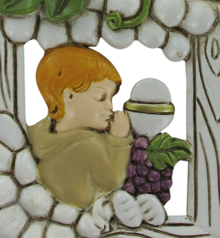 Bomboniera quadretto per la prima comunione di una bambino realizzato in resina bianca.