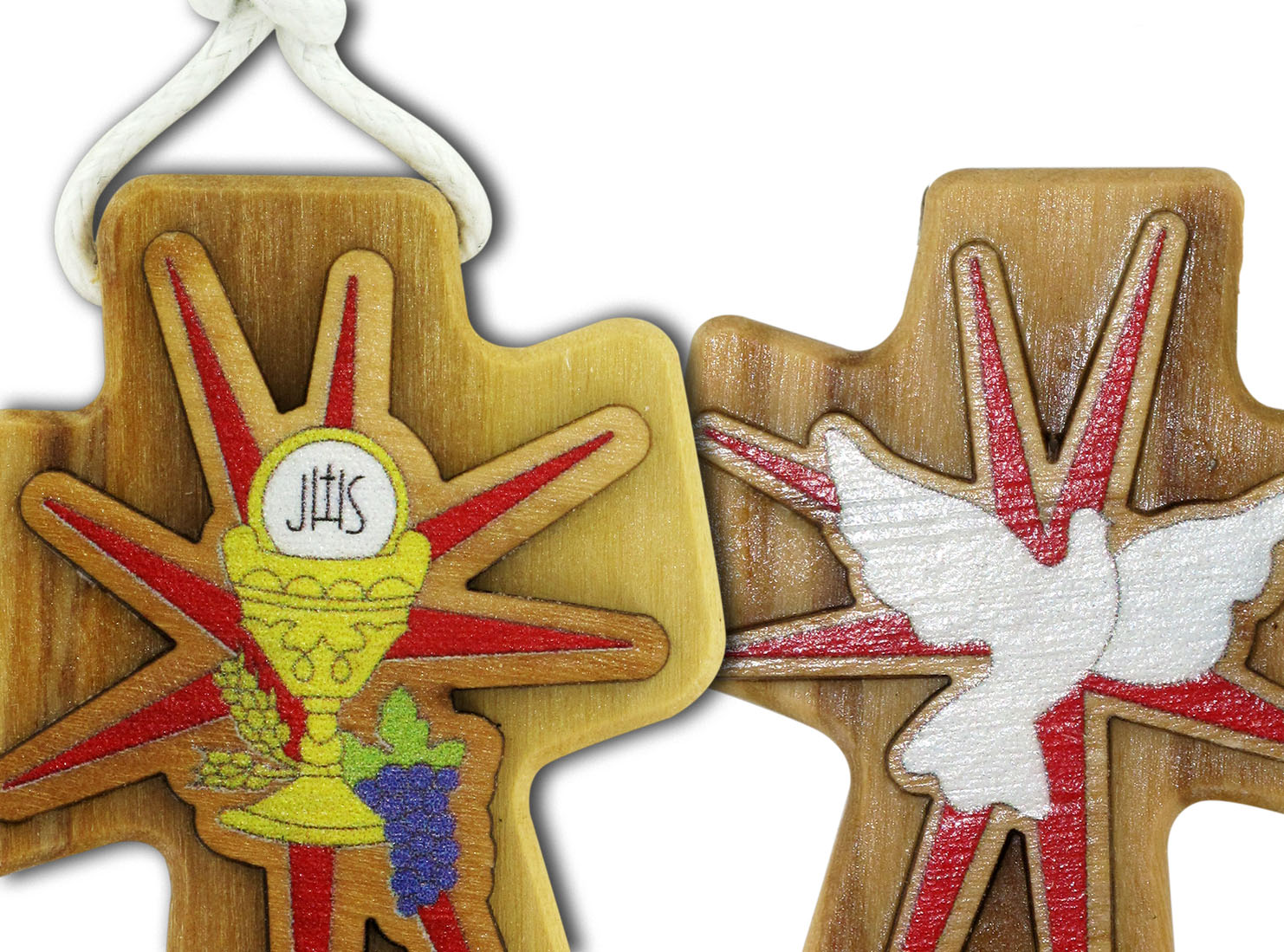 Bomboniera comunione: Croce in legno d'ulivo con i simboli della cresima e comunione - 4,7 cm