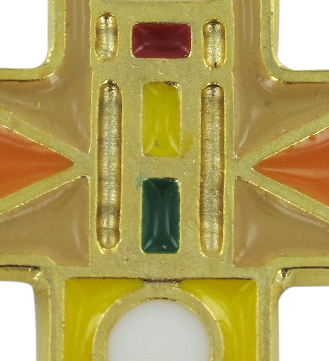 Pendente Croce di misura 3,5 x 2,5 con cordoncino imitazione cauciù nero. La croce è in metallo dorato ed ha motivi geometrici smaltati in colore arancio di varie tonalità.