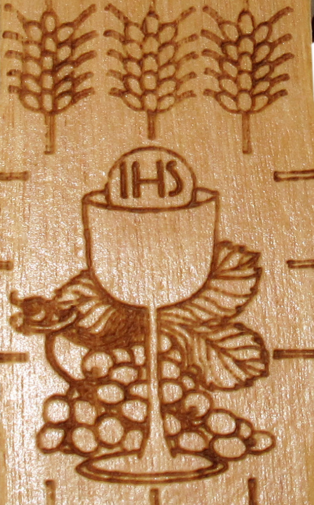 Croce in ulivo di cm 5,5 x 4,5 con raffigurato il calice e le spighe. Viene consegnata con il suo cordino.