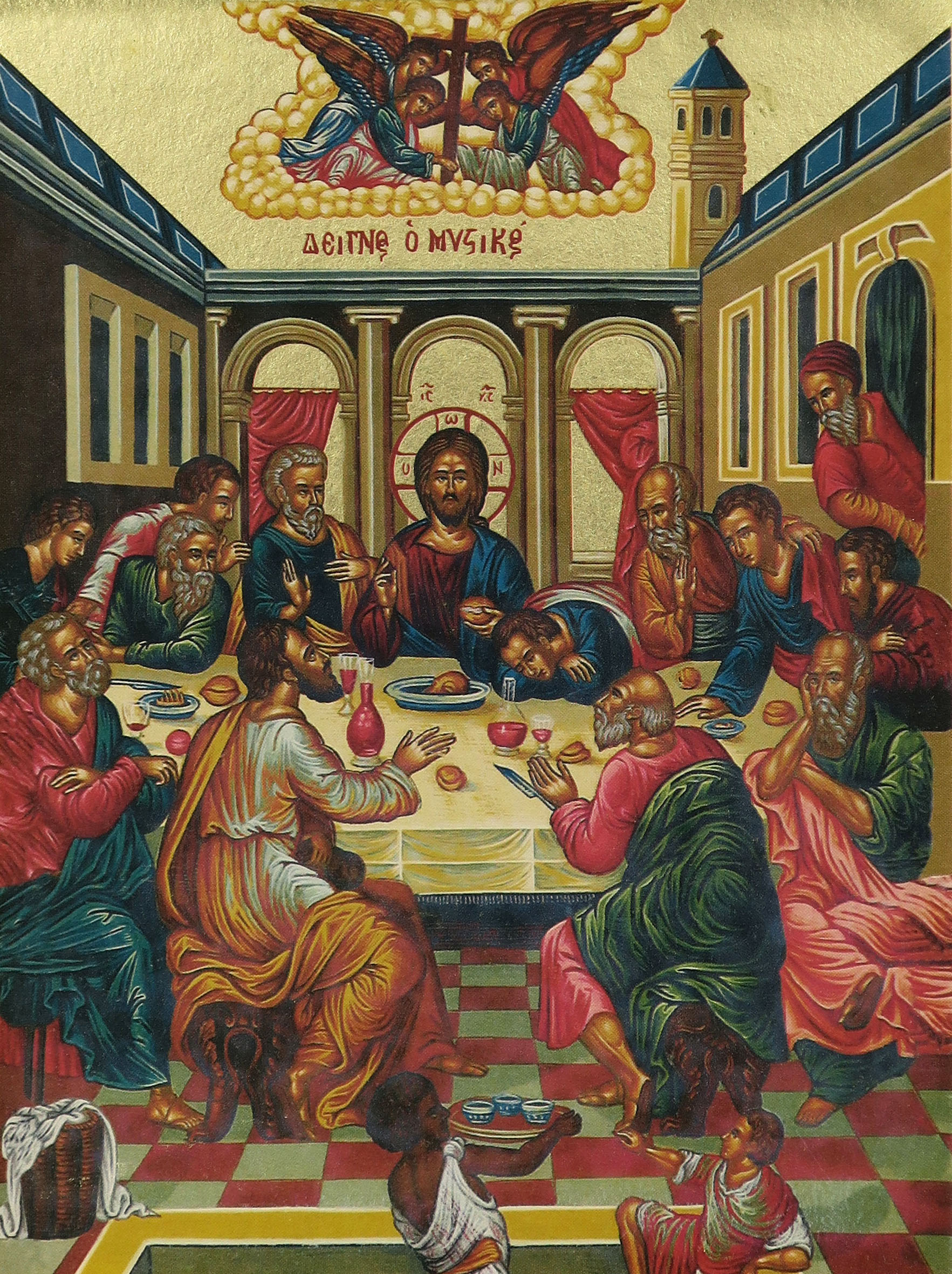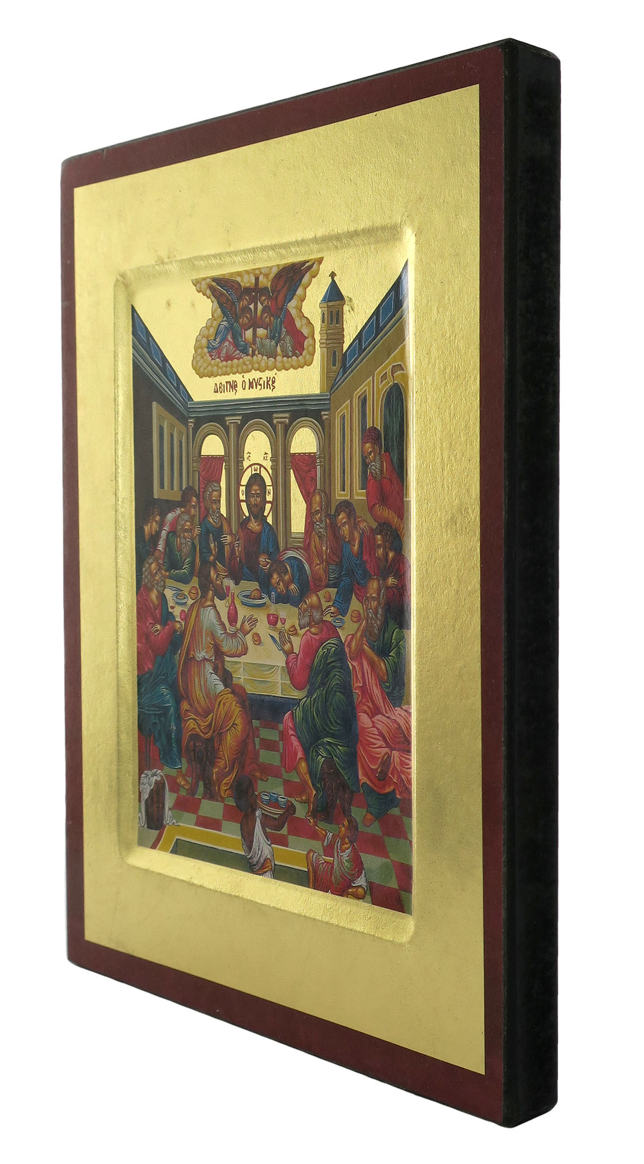 L'icona ci presenta il Cristo attorniato dai 12 apostoli nell'Ultima Cena prima della sua passione. Si trata di una stampa su legno.