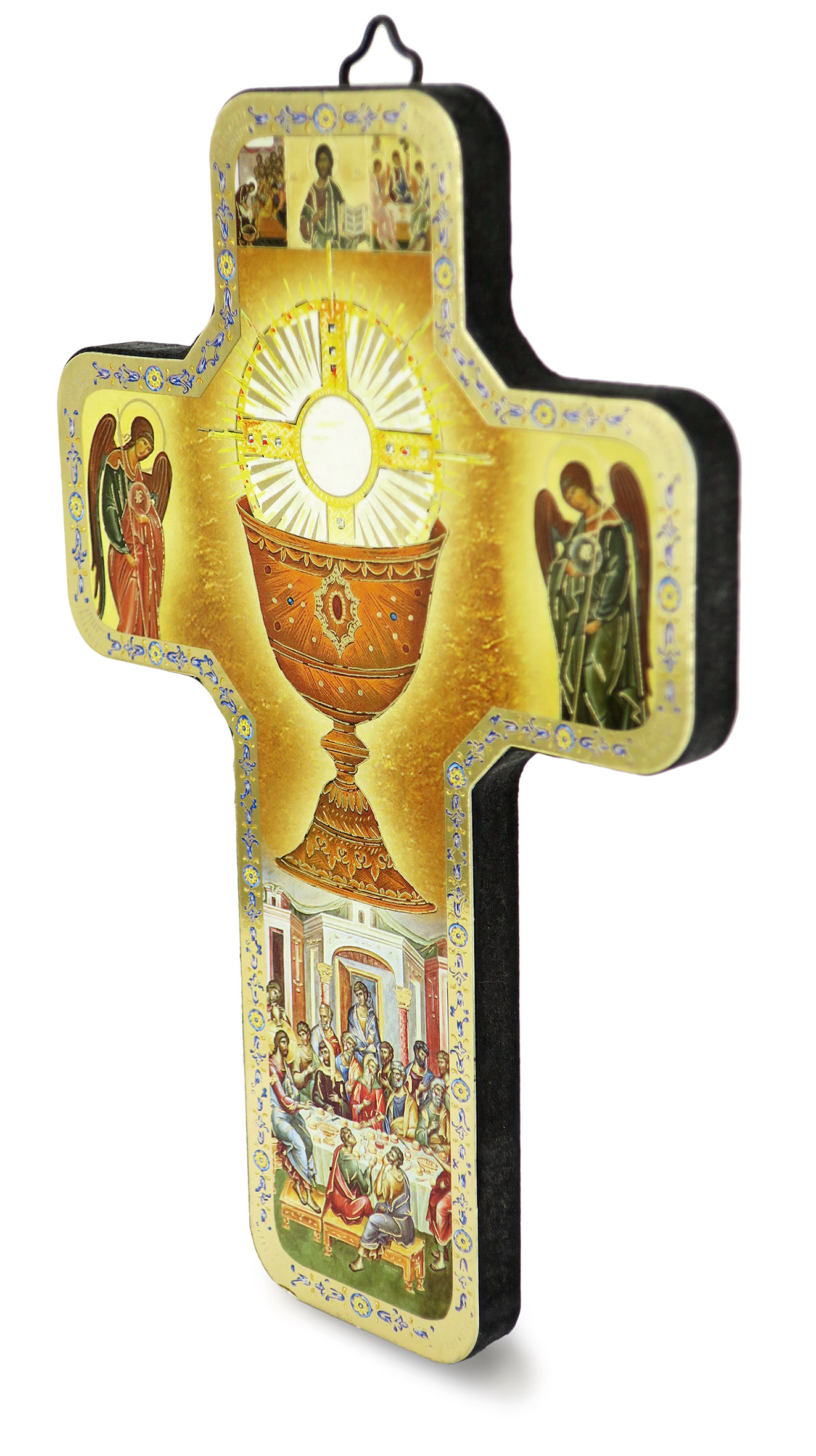 Croce icona realizzata in legno mdf con applicazione di una stampa raffigurante alcune scene della vita di Gesù,la Santa Trinità,il calice(uno dei siboli della conunione) e due Arcangeli.