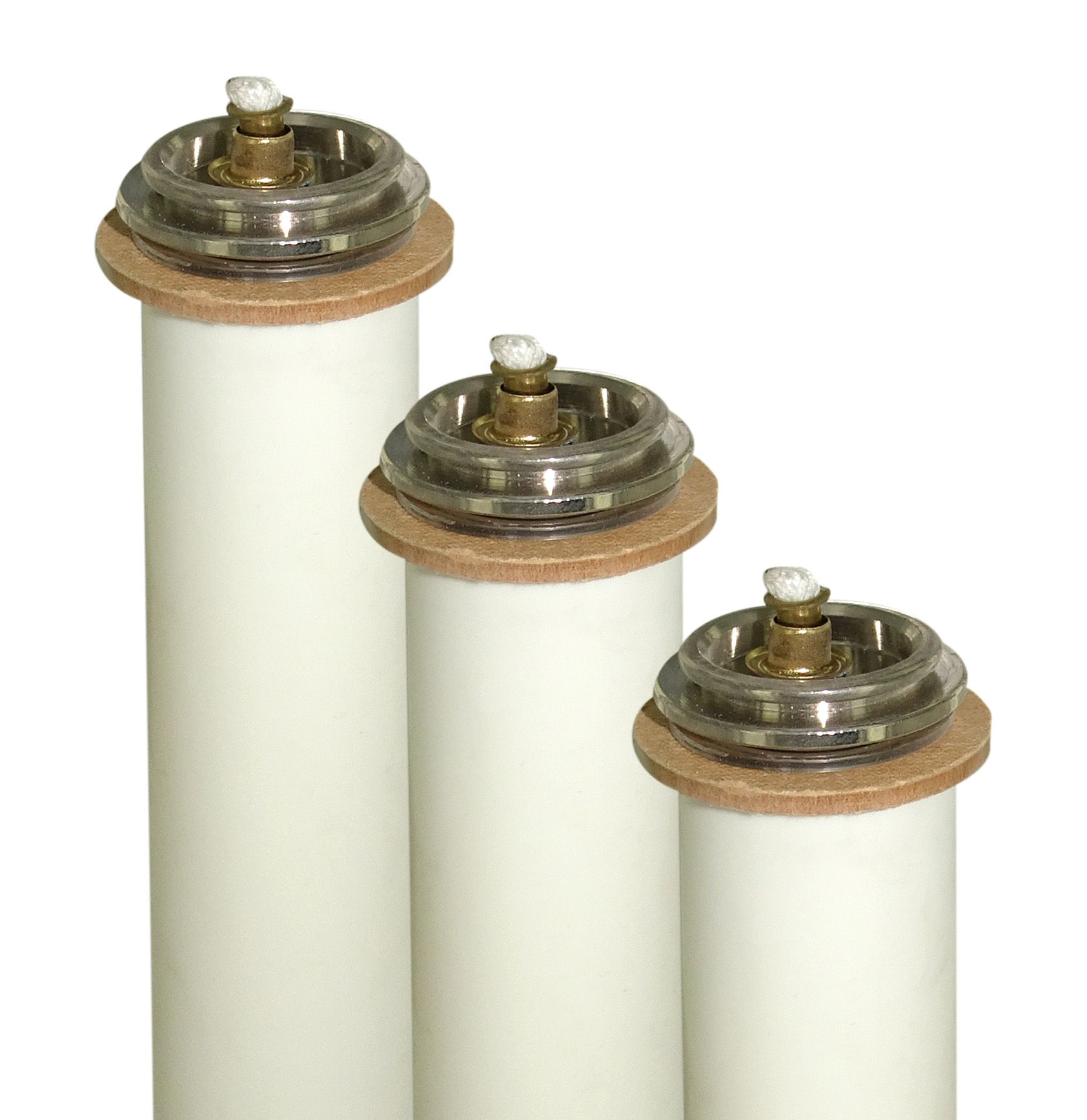 Finta candela a cera liquida realizzata in PVC. Dimensioni: 2,5 cm di diametro e 20 cm d'altezza. La candela è completa di cartuccia con stoppino e gigler. Sulla cartuccia interna sono indicati i livelli con la relativa durata. Questo prodotto è disponibile anche in altre misure (la candela è sempre di diametro 2,5 cm):