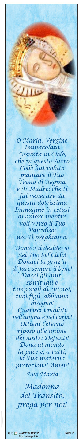 Candela in vera cera i blister con l'immagine Madonna del Transito di cm 4,5x25,5 con stampata una preghiera a lei dedicata.