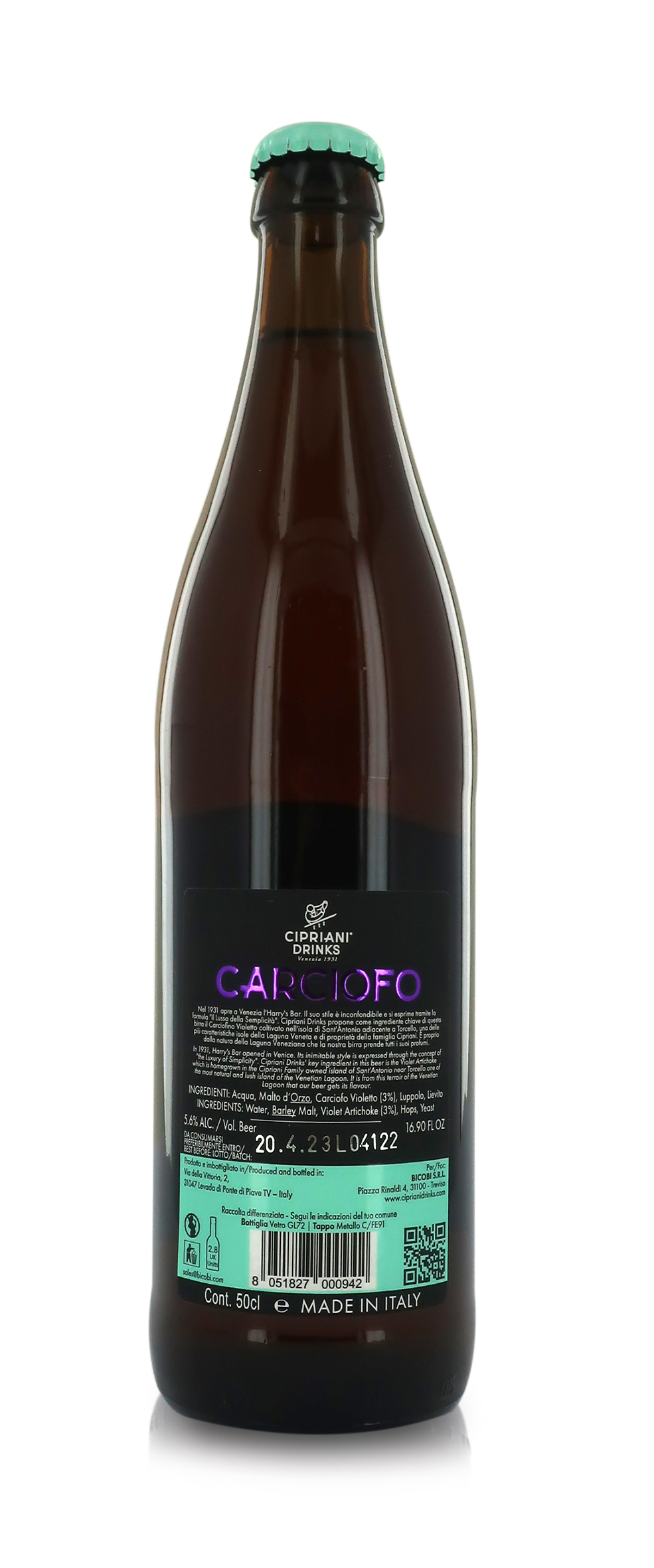 Birra italiana aromatizzata al carciofo veneto violetto dell'isola di Torcello. Il carciofo violetto è un ingrediente unico al mondo, cresce solo nella laguna di Venezia. Cipriani ha sempre valorizzato le materie prime del territorio italiano. Ecco dunque una birra al carciofo, ambrata e dal sapore intenso. Abbinamenti: cibi amidacei come cereali, riso e patate, per un equilibrio perfetto.