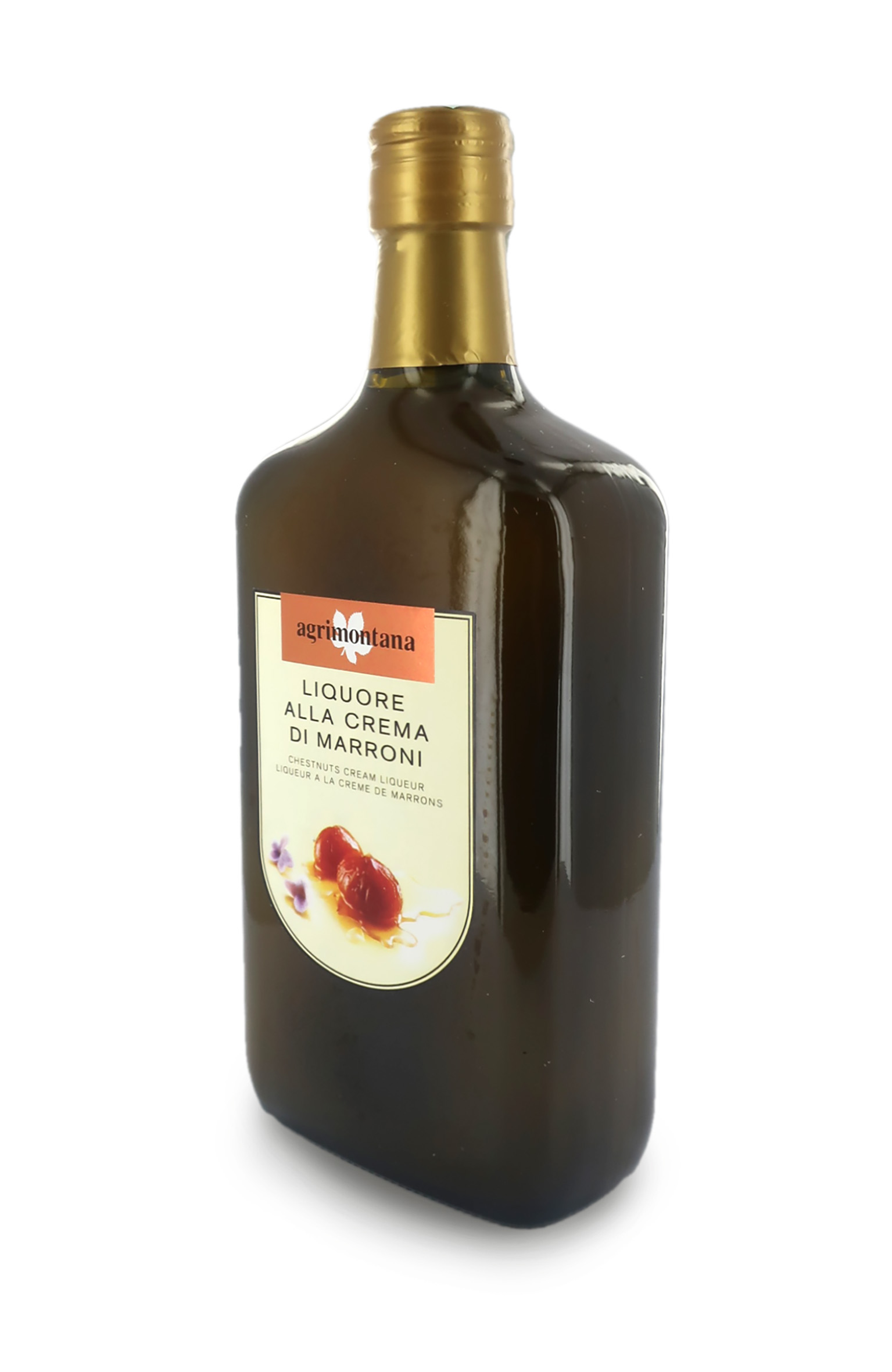 Astuccio con bottiglia in vetro da 70 cl di liquore alla crema di marroni.
