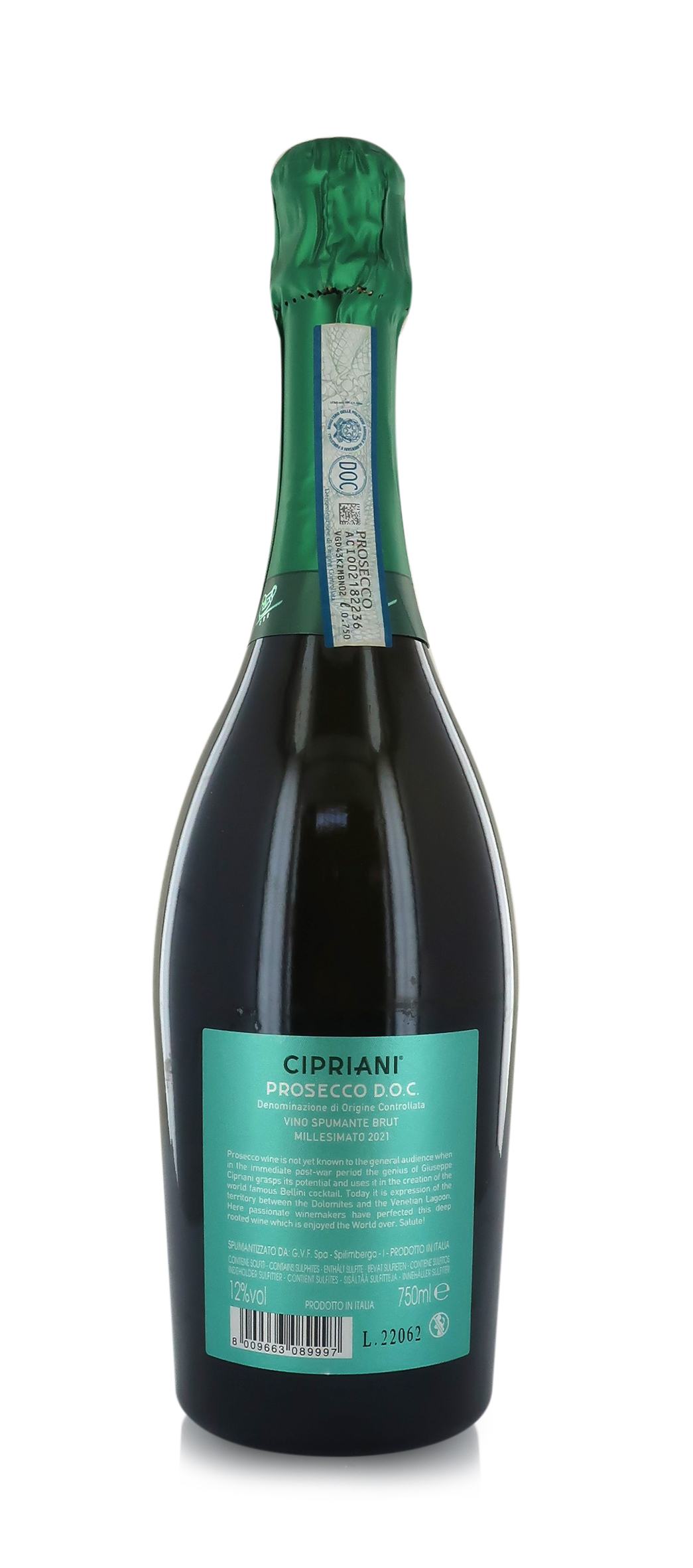 Il Prosecco Millesimato DOC Cipriani nasce dall'attenta selezione e dallo scrupoloso controllo delle migliori uve Glera svolte da personale qualificato, che vengono raccolte a mano da esperti viticoltori nel pieno rispetto delle uve stesse. Questo Prosecco Brut, quindi con un residuo zuccherino basso, è la massima espressione del territorio d’origine di questa varietà di vino italiano, presentandosi al palato nella sua caratteristica nota secca, leggermente acidula, ma al tempo stesso amabile e fruttata. / Uve: Glera (100%) / Terreno: Ghiaioso / Sistema di coltivazione: Guyot / Spumantizzazione: Metodo Charmat - 120 giorni. Conservazione del mosto in autoclavi di piccola taglia / Alcol: 12% vol. / Temperatura di servizio: 7 / 8 °C.