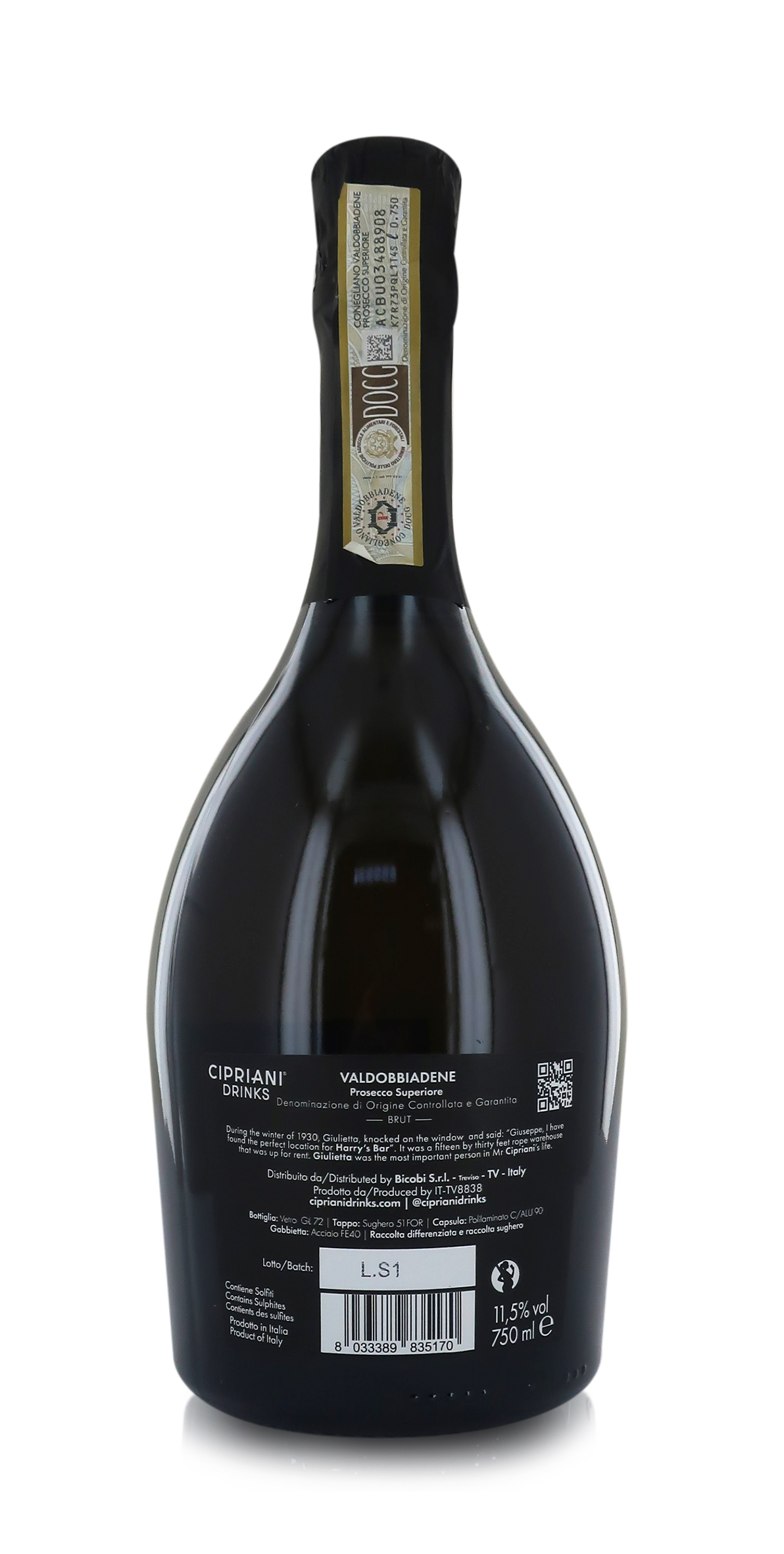 Prosecco superiore DOCG Brut Valdobbiadene Cipriani, confezione da 6 bottiglie da 750ml.