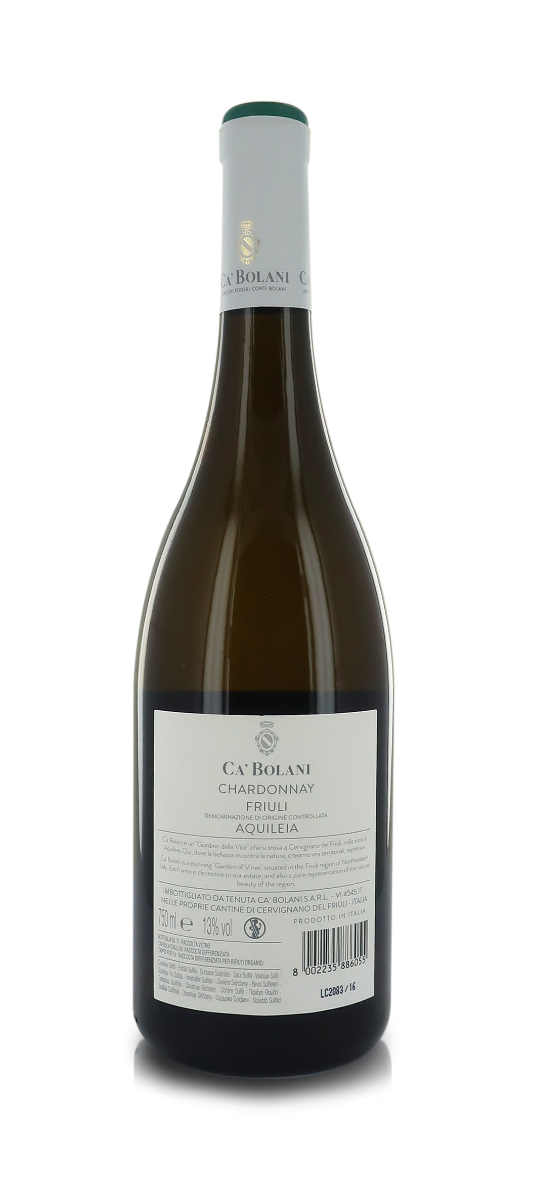 Confezione da 6 bottiglie, 750ml l’una. Le uve appena raccolte vengono trasferite alla cantina per una pigiatura soffice e delicata. La fermentazione avviene a temperatura controllata (18° - 20° C) con successiva permanenza sui propri lieviti naturali. Classificazione: Friuli DOC Aquileia / Zona di Produzione: Aquileia, Friuli / Uve: Chardonnay / Note di degustazione - Colore: giallo paglierino luminoso con riflessi verdognoli. - Profumo: elegante e fine, si contraddistingue per le note fruttate di mela renetta e pera Kaiser e per le velature di salvia e rosmarino. - Sapore: deciso in bocca, avvolgente con una buona freschezza. Bilanciato con lunga persistenza fruttata finale. / Abbinamenti: Vino da tutto pasto, ideale con primi e secon¬di piatti di pesce e verdure. CONTIENE SOLFITI. ATTENZIONE: EVENTUALE INDICAZIONE DI ANNATA IN TESTI E/O FOTO È MERAMENTE INDICATIVA; L'ANNATA INVIATA, SOGGETTA A DISPONIBILITÀ, POTRÀ VARIARE DA QUELLA IN FOTO O NEI TESTI, SENZA QUESTO RAPPRESENTARE UN ERRORE O UN DIFETTO DELL'ORDINE. Ca' Bolani - Cervignano del Friuli, Udine, Italia. Percorsa da 999 cipressi che celebrano e proteggono una straordinaria biodiversità, Ca' Bolani è una tenuta dove la vite e la natura prosperano in perfetta sintonia. Incastonata tra le Alpi e il mare del Friuli a Aquileia, in un territorio dove la viticultura fu introdotta sin dall'epoca romana, la tenuta beneficia di condizioni ideali per la produzione vitivinicola: le brezze marine estive, la protezione offerta dalle Alpi, le forti escursioni termiche, la varietà dei terreni che digradando verso il mare. La tenuta vanta un patrimonio viticolo unico, un vero e proprio parco di vigne dal quale nascono vini da fragranza e pienezza aromatica distintive.