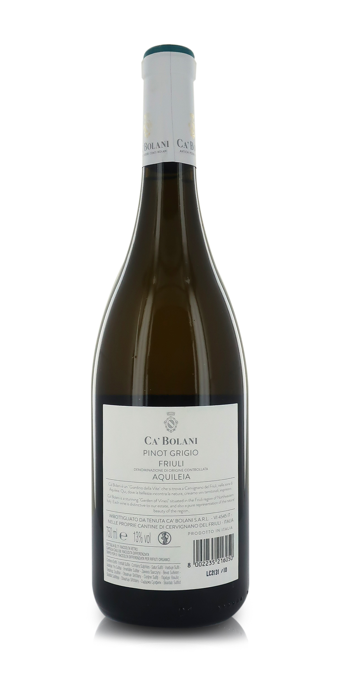 Le uve appena raccolte vengono trasferite alla cantina per una pigiatura soffice e delicata. La fermentazione viene innescata con lieviti selezionati e si sviluppa a una temperatura controllata di 18-20 °C per mantenere il fruttato e le migliori caratteristiche organolettiche del vino. Classificazione: Friuli DOC Aquileia / Zona di Produzione: Aquileia, Friuli / Uve: Pinot Grigio / Note di degustazione - Colore: giallo paglierino brillante con lieve nuance ramata. - Profumo: profumo intrigante che evolve in note di frutta matura, mela golden e scorze di cedro e in note floreali di fiori di acacia ed erbe officinali. - Sapore: il sorso è fresco e succoso. Le note sapide lo rendono persistente nel finale / Abbinamenti: Ottimo come aperitivo. Eccelle con antipasti delicati, paste ripiene e con tutti i piatti a base di pesce e di verdure. CONTIENE SOLFITI. ATTENZIONE: EVENTUALE INDICAZIONE DI ANNATA IN TESTI E/O FOTO È MERAMENTE INDICATIVA; L'ANNATA INVIATA, SOGGETTA A DISPONIBILITÀ, POTRÀ VARIARE DA QUELLA IN FOTO O NEI TESTI, SENZA QUESTO RAPPRESENTARE UN ERRORE O UN DIFETTO DELL'ORDINE. Ca' Bolani - Cervignano del Friuli, Udine, Italia. Percorsa da 999 cipressi che celebrano e proteggono una straordinaria biodiversità, Ca' Bolani è una tenuta dove la vite e la natura prosperano in perfetta sintonia. Incastonata tra le Alpi e il mare del Friuli a Aquileia, in un territorio dove la viticultura fu introdotta sin dall'epoca romana, la tenuta beneficia di condizioni ideali per la produzione vitivinicola: le brezze marine estive, la protezione offerta dalle Alpi, le forti escursioni termiche, la varietà dei terreni che digradando verso il mare. La tenuta vanta un patrimonio viticolo unico, un vero e proprio parco di vigne dal quale nascono vini da fragranza e pienezza aromatica distintive.