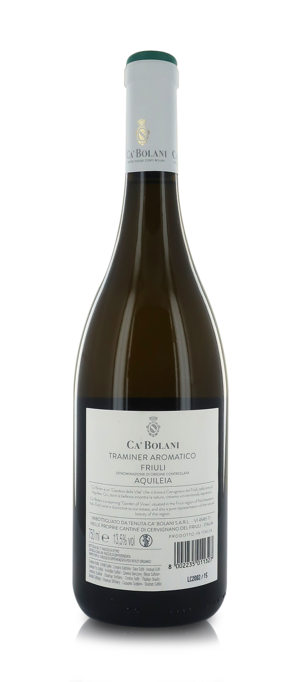 Confezione da 6 bottiglie, 750ml l’una. Le uve appena raccolte vengono trasferite alla cantina e lasciate integre all’interno della pressa per circa 12 ore, successivamente si procede alla pigiatura soffice. La fermentazione a temperatura controllata ne esalta gli aromi e il periodo di “elevage” sui lieviti amplia e completa il suo equilibrio aromatico. Classificazione: Friuli DOC Aquileia / Zona di Produzione: Aquileia, Friuli / Uve: Traminer / Note di degustazione - Colore: bella tonalità di giallo paglierino con eleganti sfumature dorate. - Profumo: l’olfatto si invade di note floreali caratteristiche del vitigno che ricordano la rosa gialla, gli agrumi, la mentuccia. - Sapore: le suggestioni olfattive sono ben riprese al gusto. Al palato stupisce per la sua ricchezza e rotondità che si accompagnano nel lungo finale a raffinate note aromatiche. / Abbinamenti: Si esalta con antipasti caldi, minestre e zuppe, piatti a base di verdure, con il pesce, le carni bianche e i formaggi freschi. CONTIENE SOLFITI. ATTENZIONE: EVENTUALE INDICAZIONE DI ANNATA IN TESTI E/O FOTO È MERAMENTE INDICATIVA; L'ANNATA INVIATA, SOGGETTA A DISPONIBILITÀ, POTRÀ VARIARE DA QUELLA IN FOTO O NEI TESTI, SENZA QUESTO RAPPRESENTARE UN ERRORE O UN DIFETTO DELL'ORDINE. Ca' Bolani - Cervignano del Friuli, Udine, Italia. Percorsa da 999 cipressi che celebrano e proteggono una straordinaria biodiversità, Ca' Bolani è una tenuta dove la vite e la natura prosperano in perfetta sintonia. Incastonata tra le Alpi e il mare del Friuli a Aquileia, in un territorio dove la viticultura fu introdotta sin dall'epoca romana, la tenuta beneficia di condizioni ideali per la produzione vitivinicola: le brezze marine estive, la protezione offerta dalle Alpi, le forti escursioni termiche, la varietà dei terreni che digradando verso il mare. La tenuta vanta un patrimonio viticolo unico, un vero e proprio parco di vigne dal quale nascono vini da fragranza e pienezza aromatica distintive.