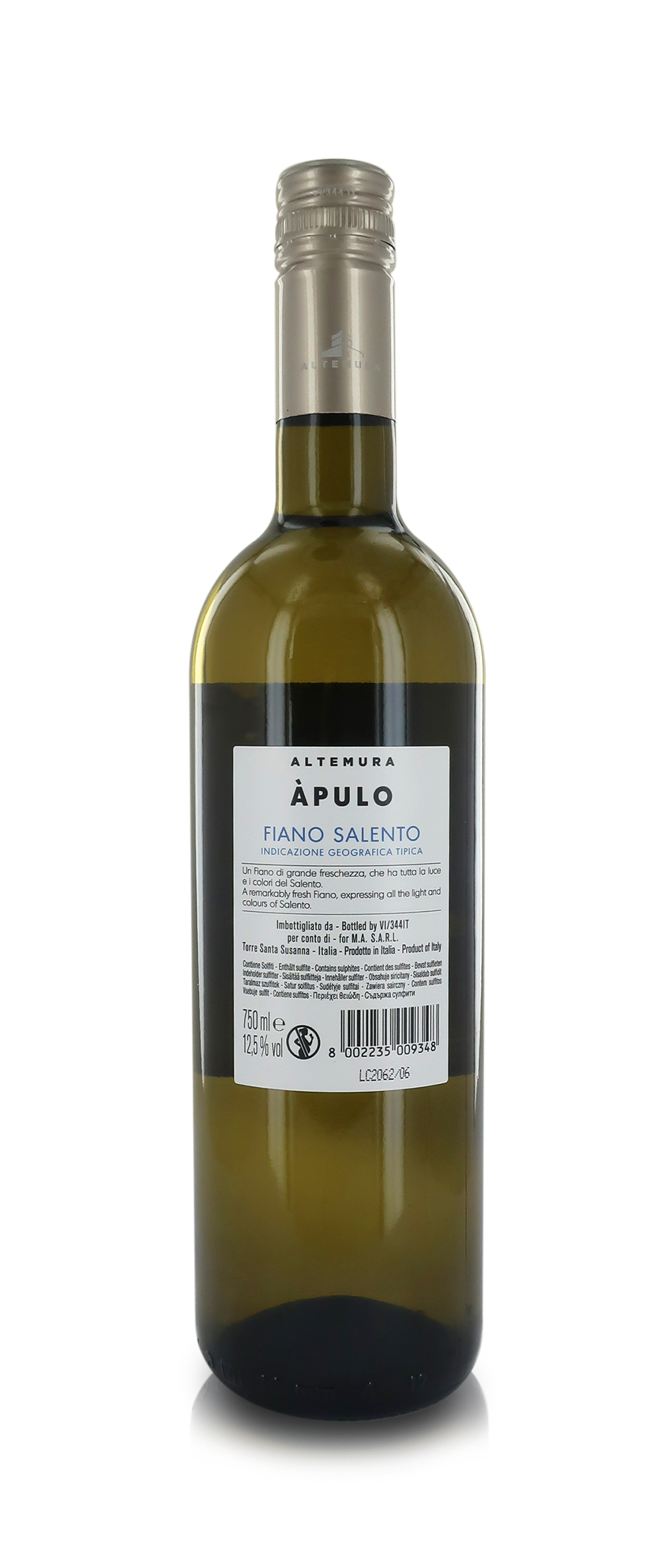Vino pugliese Àpulo Bianco Fiano del Salento IGT in confezione da 6 bottiglie da 750 ml. Le uve vengono sottoposte a una pressatura soffice e successivamente a una fermentazione di 5/6 giorni a una temperatura di 17 °C. Il vino affina per circa 3 mesi in acciaio e per un periodo ulteriore in bottiglia. Classificazione: Salento IGT / Area di produzione: Provincia di Brindisi / Uve: Fiano e Falanghina / Note di degustazione – Colore: giallo paglierino intenso con accese sfumature verdognole. / Profumo: intense note di pesca, pompelmo e scorza di limone. / Sapore: fresco e ricco, con una delicata nota di frutta esotica e un carattere fruttato invitante, sostenuto da un’acidità piacevole e vivace. / Abbinamenti: Ottimo come aperitivo, è un bianco in grado di accompagnare piacevolmente tutto il pasto. Particolarmente indicato con piatti a base di crostacei, pasta condita con sughi delicati, pesce o carni bianche alla griglia. CONTIENE SOLFITI. ATTENZIONE: EVENTUALE INDICAZIONE DI ANNATA IN TESTI E/O FOTO È MERAMENTE INDICATIVA; L'ANNATA INVIATA, SOGGETTA A DISPONIBILITÀ, POTRÀ VARIARE DA QUELLA IN FOTO O NEI TESTI, SENZA QUESTO RAPPRESENTARE UN ERRORE O UN DIFETTO DELL'ORDINE. Masseria Altemura è situata nel cuore della penisola salentina, a metà strada tra lo Ionio e l’Adriatico, in una terra dal carattere mediterraneo, dove luce, vento e mare si fondono in un’unica alchimia. La tenuta, che si estende all’interno del territorio di produzione del DOC Primitivo di Manduria, in provincia di Brindisi, include un’antica Masseria del XVII secolo e una cantina contemporanea, circondate dal verde di vigneti e uliveti. La Famiglia Zonin ha visto in questa terra, in Masseria Altemura in particolare, il potenziale progetto di contribuire alla rinascita della vitivinicoltura pugliese.