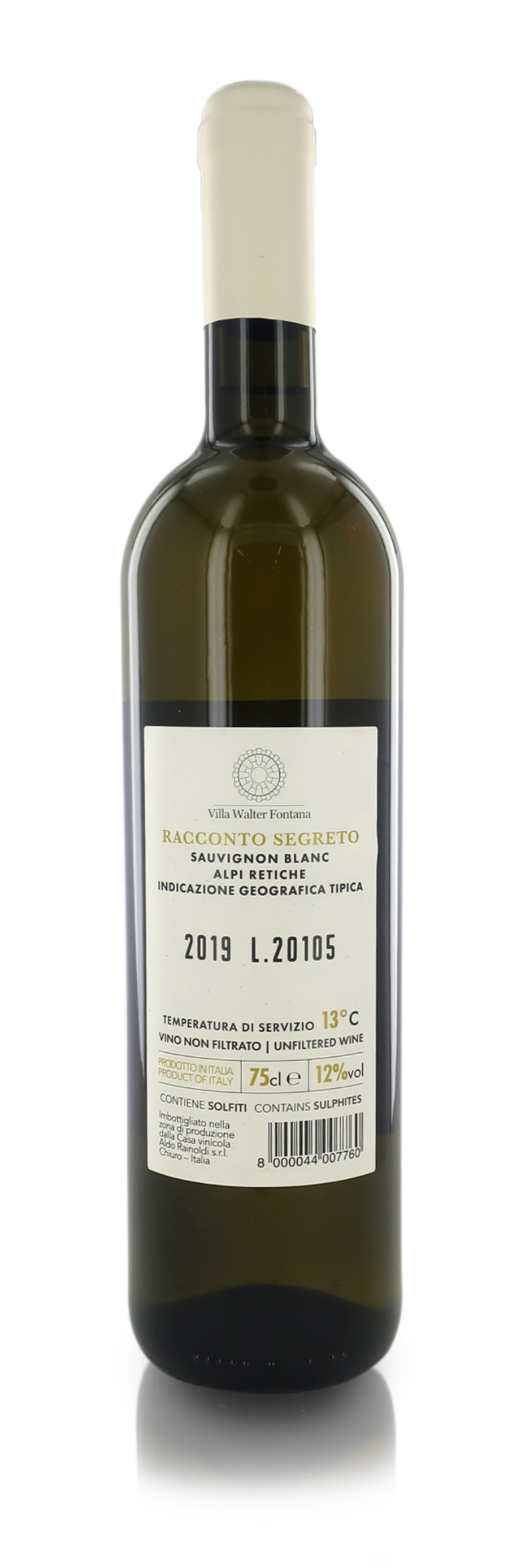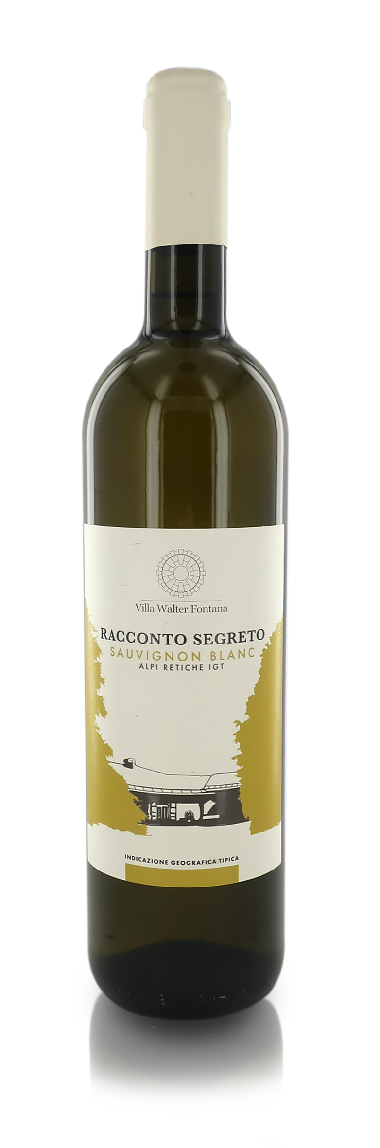 Vino bianco valtellinese "Racconto Segreto" del marchio "Villa Walter Fontana". Cartone di 6 bottiglie da 750 ml l'una. Si tratta di un Sauvignon Blanc Alpi Retiche IGT realizzato con varietà d'uva "Sauvignon Blanc". Rientra nel gruppo dei vini bianchi fermi. Vanta una gradazione alcolica di 12% e un colore giallo paglierino con riflessi verdognoli. All'olfatto, si percepisce un bouquet tipico del Sauvignon, con sentori di frutta tropicale, note agrumate e fiori bianchi. Al palato, il sapore è complesso, fresco e persistente.