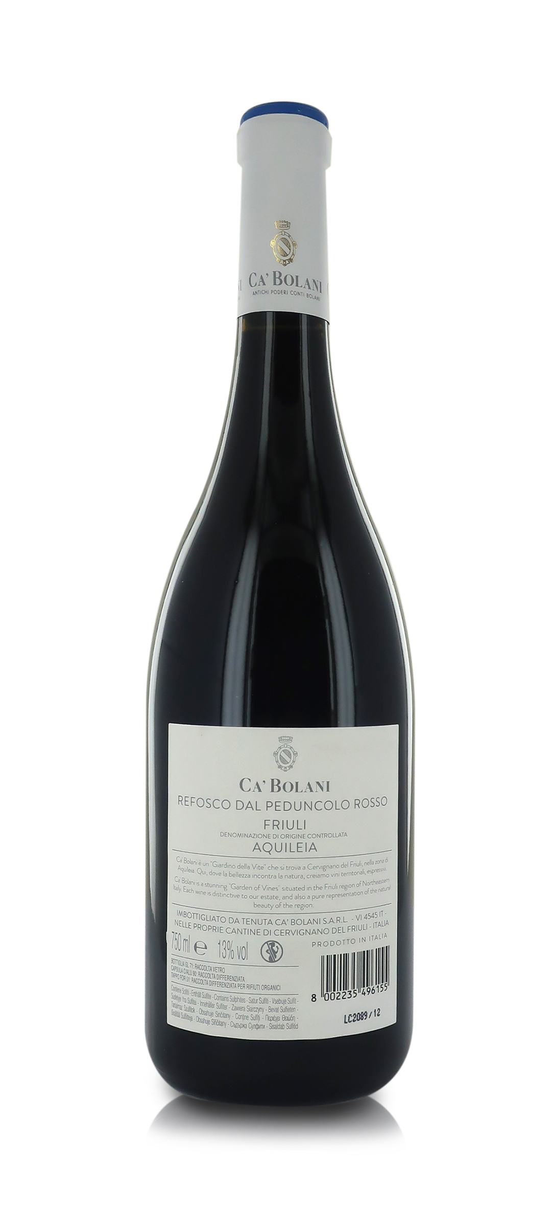 Confezione da 6 bottiglie, 750ml l’una. Dopo la pigiatura e la diraspatura, il mosto subisce un processo di fermentazione e macerazione di 8-12 giorni in acciaio, consentendo una considerevole estrazione di colore e di sostanze polifenoliche. Dopo la fermentazione malo-lattica, il vino matura in botti di rovere. Classificazione: Friuli DOC Aquileia / Zona di Produzione: Aquileia, Friuli / Uve: Refosco dal Peduncolo Rosso / Note di degustazione: Colore: intenso, brillante con note violacee. - Profumo: emergono sentori di visciole in confettura e spezie con leggere note erbacee e di resina. - Sapore: denso e fruttato che ben si contrappone a un’energica freschezza. I tannini sono morbidi e il finale è lungo e persistente. / Abbinamenti: ideale a tutto pasto. Si abbina con primi piatti con sughi, con piatti di carne in umido e formaggi di media e lunga stagionatura. Ideale anche come aperitivo o dopo cena. CONTIENE SOLFITI. ATTENZIONE: EVENTUALE INDICAZIONE DI ANNATA IN TESTI E/O FOTO È MERAMENTE INDICATIVA; L'ANNATA INVIATA, SOGGETTA A DISPONIBILITÀ, POTRÀ VARIARE DA QUELLA IN FOTO O NEI TESTI, SENZA QUESTO RAPPRESENTARE UN ERRORE O UN DIFETTO DELL'ORDINE. Ca' Bolani - Cervignano del Friuli, Udine, Italia. Percorsa da 999 cipressi che celebrano e proteggono una straordinaria biodiversità, Ca' Bolani è una tenuta dove la vite e la natura prosperano in perfetta sintonia. Incastonata tra le Alpi e il mare del Friuli a Aquileia, in un territorio dove la viticultura fu introdotta sin dall'epoca romana, la tenuta beneficia di condizioni ideali per la produzione vitivinicola: le brezze marine estive, la protezione offerta dalle Alpi, le forti escursioni termiche, la varietà dei terreni che digradando verso il mare. La tenuta vanta un patrimonio viticolo unico, un vero e proprio parco di vigne dal quale nascono vini da fragranza e pienezza aromatica distintive.