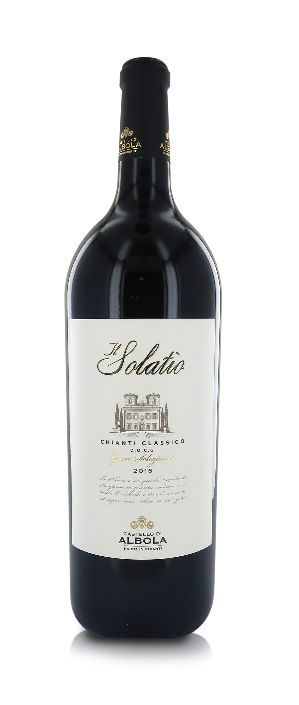 MAGNUM da 1,5 lt in CASSETTA DI LEGNO. Chianti Classico DOCG Gran Selezione "Il Solatìo", ottenuto da uve maturate nel cuore della tenuta di Castello di Albola, in una posizione formidabile che rende magico lo scosceso pendio roccioso chiamato Solatìo per la sua esposizione alla piena luce del sole di Sud–Est (alt. dai 550 ai 580 m). Zona di produzione: Radda in Chianti, Chianti Classico. / Uve: 100% Sangiovese. / Modalità di raccolta: Manuale in bins. / Metodo di allevamento: Cordone Speronato. / Il mosto ottenuto da uve Sangiovese in purezza è sottoposto a una vinificazione in rosso semplice e tradizionale che prevede una macerazione di circa 3 settimane. Completata la macerazione e la fermentazione, il vino è posto a maturare in barrique di rovere di Allier per 14 mesi. Segue un lungo affinamento in bottiglia di circa un anno e mezzo. / Colore: rosso rubino intenso con riflessi granati; profumo: intenso con sentori di confettura di ciliegia, note officinali, speziate di cannella, pepe e tabacco; sapore: elegante e sapido con note di frutta a bacca rossa scura e spezie. Finale lungo e persistente. / Abbinamenti gastronomici: carni rosse, cacciagione e formaggi stagionati. CONTIENE SOLFITI. ATTENZIONE: EVENTUALE INDICAZIONE DI ANNATA IN TESTI E/O FOTO È MERAMENTE INDICATIVA; L'ANNATA INVIATA, SOGGETTA A DISPONIBILITÀ, POTRÀ VARIARE DA QUELLA IN FOTO O NEI TESTI, SENZA QUESTO RAPPRESENTARE UN ERRORE O UN DIFETTO DELL'ORDINE. Il borgo medievale di Castello di Albola sorge in cima alle splendide colline chiantigiane. Dal 1979 è di proprietà della Famiglia Zonin, che da quarant’anni le dedica le sue migliori cure. Insieme al recupero e al restauro della villa e del borgo, è stata edificata la nuova cantina, perfettamente armonizzata nel paesaggio circostante. La Famiglia Zonin si è impegnata per ampliare sia i vigneti che la fattoria.