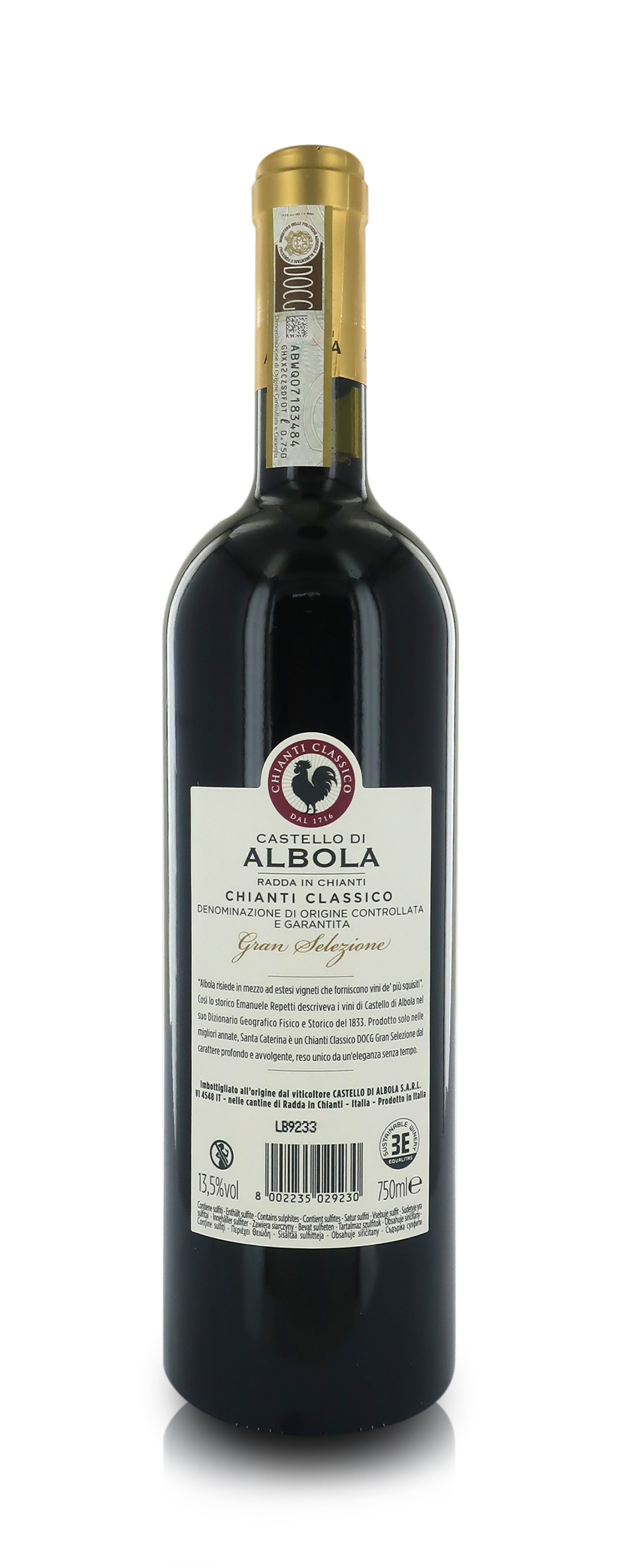 6 bottiglie da 750ml l'una in scatola di legno. Il Chianti Classico Gran Selezione Santa Caterina prende il nome da un vigneto singolo di poco più di cinque ettari, esposto completamente a Sud a una altitudine media di 550 metri. Una parcella privilegiata per la composizione del terreno, ricco di galestro, e per la qualità delle uve Sangiovese che vi si coltivano. Vinificate in purezza, affinate a lungo con un uso misurato dei legni, si traducono nel bicchiere in un vino lucente, dal profumo dilagante e dal sorso incisivo e interminabile, interprete autentico dell’anima di Castello di Albola. Classificazione: Chianti Classico DOCG Gran Selezione / Zona di produzione: Radda in Chianti, Chianti Classico. / Uve: 100% Sangiovese. / Colore: rosso rubino intenso con riflessi granati; Profumo: intenso ed elegante con note floreali di giglio e una buona concentrazione di frutta rossa matura; Sapore: palato deciso, voluminoso e dolcemente tannico, finale lungo e persistente. / Abbinare con primi piatti saporiti, carni rosse, arrosti, selvaggina e formaggi stagionati e semi stagionati. CONTIENE SOLFITI. ATTENZIONE: EVENTUALE INDICAZIONE DI ANNATA IN TESTI E/O FOTO È MERAMENTE INDICATIVA; L'ANNATA INVIATA, SOGGETTA A DISPONIBILITÀ, POTRÀ VARIARE DA QUELLA IN FOTO O NEI TESTI, SENZA QUESTO RAPPRESENTARE UN ERRORE O UN DIFETTO DELL'ORDINE. Il borgo medievale di Castello di Albola sorge in cima alle splendide colline chiantigiane. Insieme al recupero e al restauro della villa e del borgo, è stata edificata la nuova cantina, perfettamente armonizzata nel paesaggio circostante. La Famiglia Zonin si è impegnata per ampliare sia i vigneti che la fattoria, che oggi si estende per 900 ettari, di cui oltre 125 coltivati a vite e dove svettano oltre 4 mila piante di olivo.