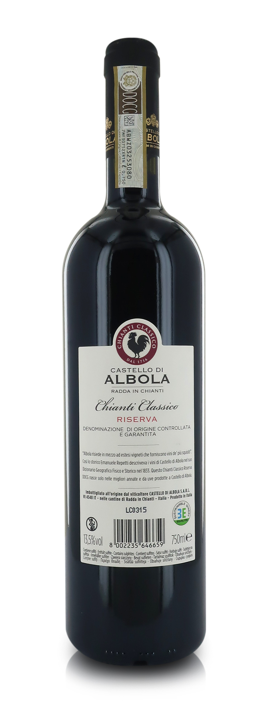 Chianti Classico DOCG Riserva, bottiglia da 750ml. Questa preziosa Riserva racchiude in sé le migliori uve di otto vigneti in selezione di Castello di Albola, ognuno dei quali contribuisce al risultato finale con una particolare sfumatura di Sangiovese, vinificato in purezza. Nel profumo si riconosce la forza del bosco e la finezza dei filari più alti, mentre il sorso traduce in potenza espressiva il calore della terra. Quasi tre anni di riposo, di cui quattordici mesi in rovere e ulteriori diciotto nel vetro concludono un affinamento che sottolinea una personalità traboccante, tannini levigati, un sorso sapido e concentrato, ricordi di frutta nera e fiori recisi.