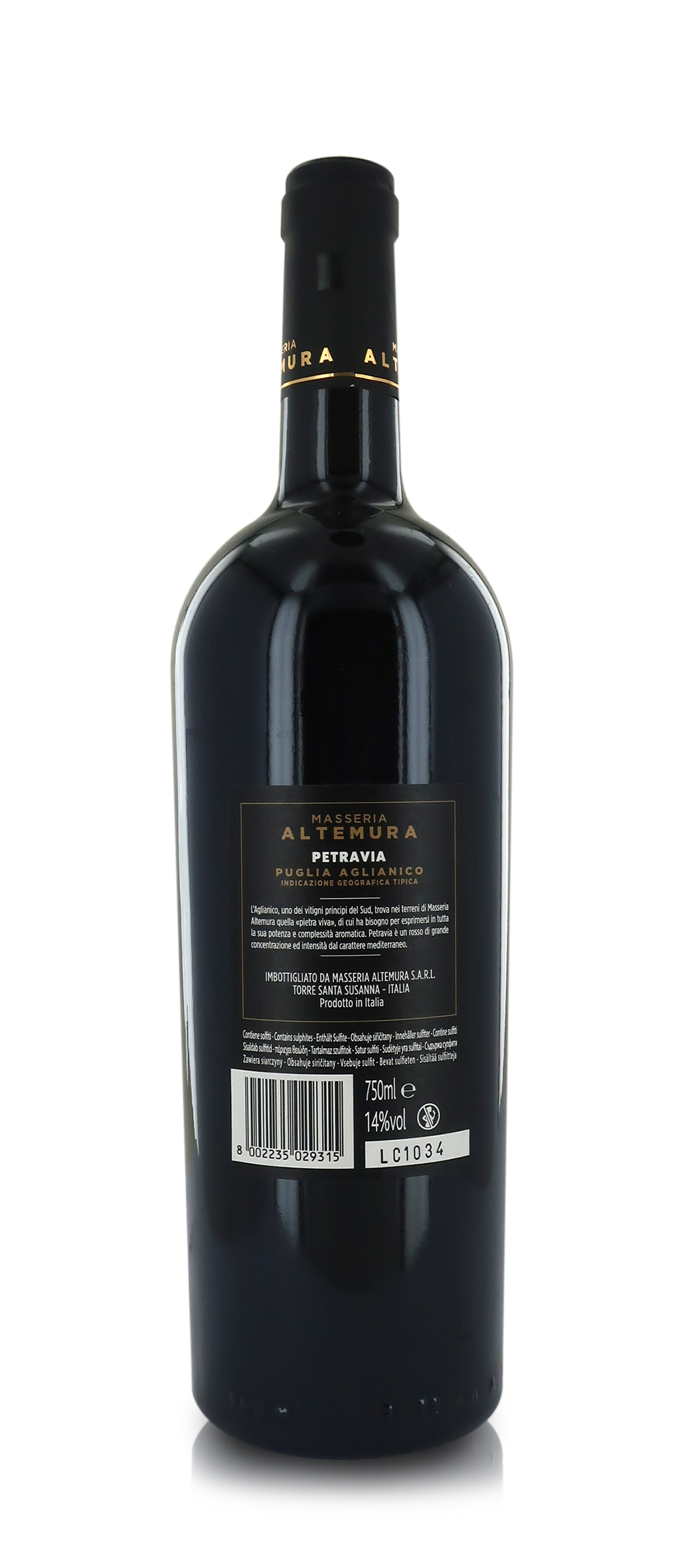 Questo vino pugliese Aglianico, ottenuto da uno dei vitigni più nobili del Sud, trova nei terreni di Masseria Altemura quella «pietra viva» di cui ha bisogno per esprimersi in tutta la sua potenza e complessità aromatica. Petravia è un rosso di grande concentrazione dai tannini ben evidenti, in grado di evolvere dai volumi più rotondi e dalle esuberanze della sua giovinezza all’eleganza della maturità. Petravia matura in tonneaux da 350 e 400 litri per 15 mesi, con un successivo affinamento in bottiglia per altri 12 mesi. Classificazione: Puglia IGT / Zona di produzione: Provincia di Brindisi / Uve: 100% Aglianico / Note di degustazione – Colore: rosso rubino carico e profondo. / Profumo: intenso e avvolgente con aromi di ciliegia, mora, pera e note di spezie come pepe nero e bacche di ginepro. / Sapore: vino dalla grande struttura, importante e persistente con una decisa trama tannica e una spiccata freschezza. / Abbinamenti: selvaggina sia da piuma che da pelo, piatti a base d’anatra o fagiano, capriolo o cinghiale e formaggi stagionati.