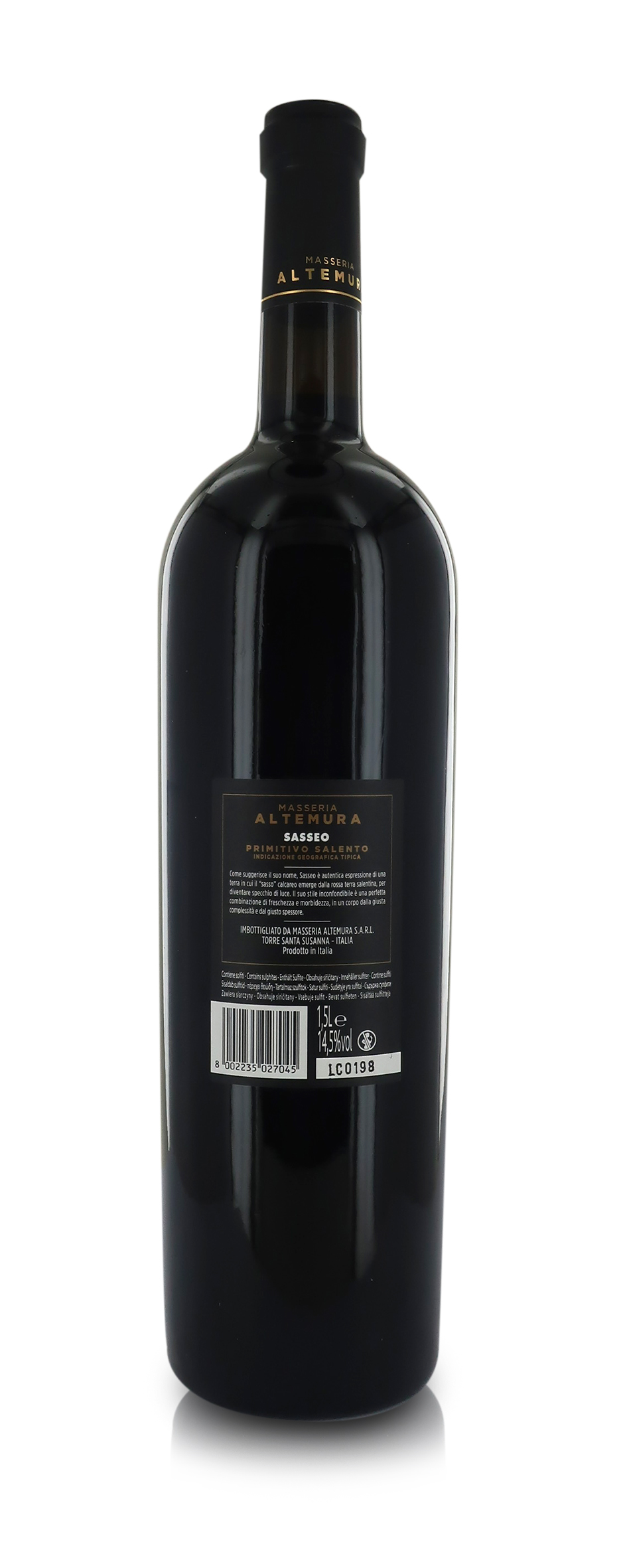 MAGNUM da 1,5 litri in CASSETTA DI LEGNO. Nato dalla volontà di creare un Primitivo dalla spiccata personalità, Sasseo è oggi uno dei vini pugliesi più affermati nel panorama internazionale. Come suggerisce il suo nome, è diretta espressione di un terreno in cui il “sasso” calcareo emerge dalla rossa terra salentina, per diventare specchio di luce. Il suo stile inconfondibile è una perfetta combinazione di freschezza e morbidezza, in un corpo dalla giusta complessità e dal giusto spessore. Classificazione: Salento IGT / Zona di produzione: Provincia di Brindisi / Uve: 100% Primitivo / Note di degustazione – Colore: rosso rubino cupo e profondo / Profumo: al naso dispiega profumi intensi e pieni che richiamano la prugna, la confettura di frutta rossa con dolci accenti di spezie. / Sapore: vino di buon corpo, in bocca è avvolgente, caldo, morbido ed esprime un fruttato molto maturo, sostenuto da una piacevole trama di tannini dolci. / Abbinamenti: primi piatti saporiti, carni bianche e rosse alla brace o salsate, agnello al forno e formaggi stagionati ma non erborinati.