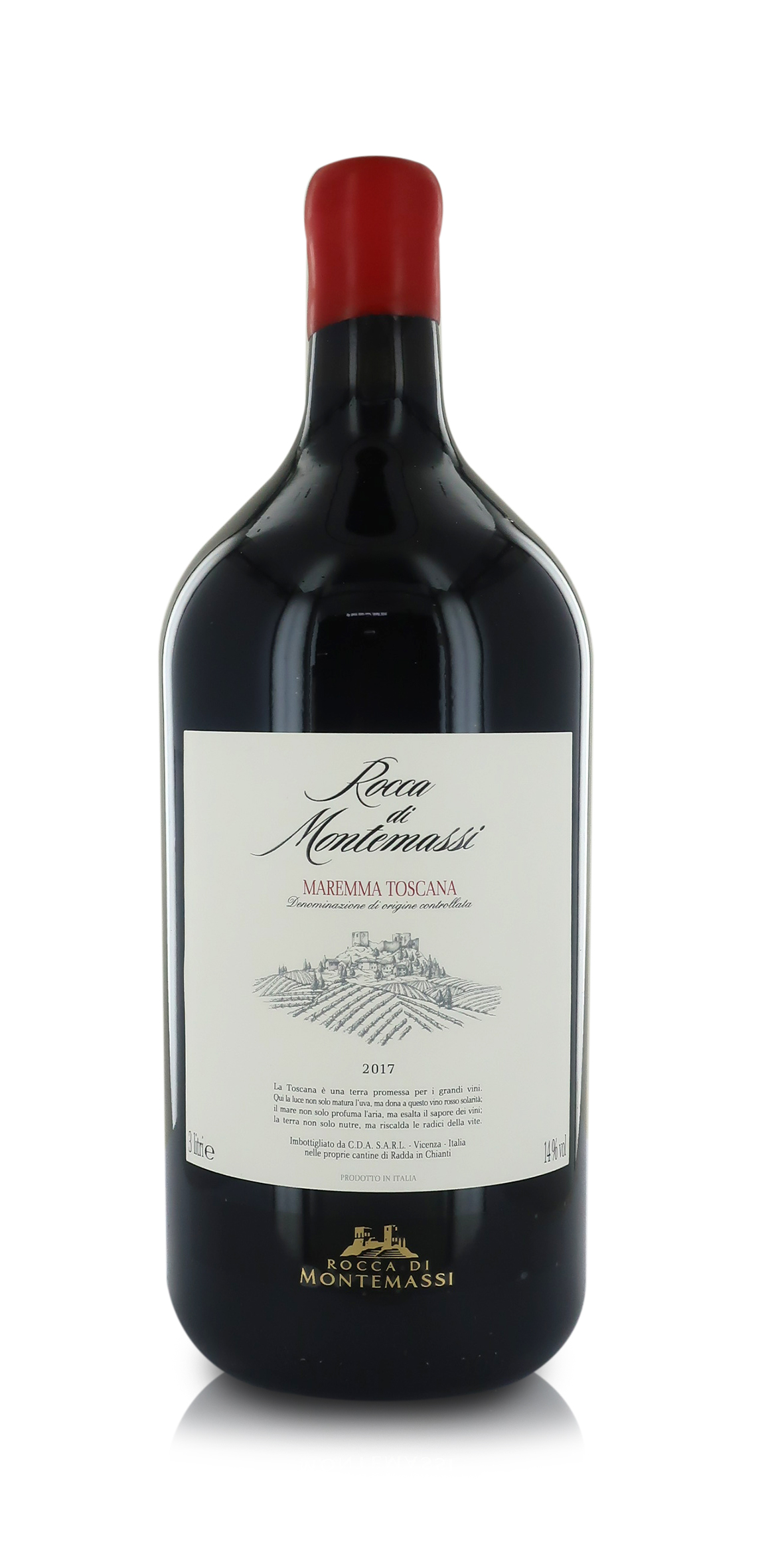 BOTTIGLIA MAGNUM da 3 lt in CASETTA DI LEGNO. Rocca di Montemassi Maremma Toscana DOC: un grande rosso toscano, massima interpretazione del terroir di Rocca di Montemassi, che unisce il calore della terra, i profumi intensi della natura e le fresche brezze del mare. Tutto questo in un vino di carattere, dotato di grande finezza ed equilibrio, che racconta il meglio che la Maremma sa offrire. Classificazione: Maremma Toscana DOC / Uve: 35% Syrah, 35% Petit Verdot, 30% Cabernet Sauvignon / Colore: Rosso rubino. / Profumo: Intenso ed evoluto con note di frutta nera, sottobosco e sentori di tabacco. / Sapore: Concentrato e seducente con lievi sentori di spezie e un perfetto equilibrio. Il finale è lungo e persistente.