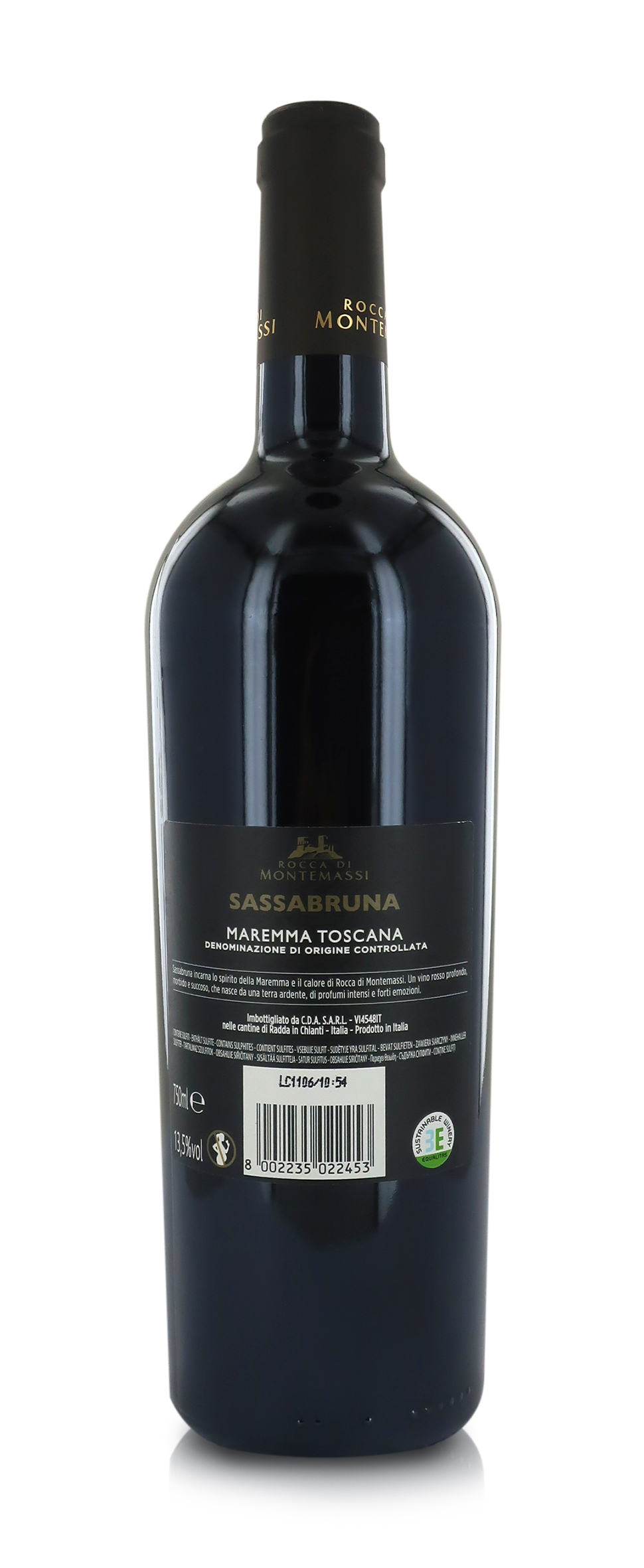 Sassabruna incarna lo spirito della Maremma e il calore di Rocca di Montemassi. Un vino profondo, morbido e succoso, che nasce da una terra ardente, di profumi intensi e forti emozioni. Classificazione: Maremma Toscana DOC / Uve: 80% Sangiovese, 10% Merlot, 10% Syrah / Colore: Rosso rubino molto intenso. / Profumo: Ricco e complesso con evidenti note di frutta rossa matura e di sottobosco, accompagnate da sentori speziati e di liquirizia. / Sapore: di corpo, avvolgente e con un finale persistente in cui si colgono le note speziate avvertite al naso. CONTIENE SOLFITI. ATTENZIONE: EVENTUALE INDICAZIONE DI ANNATA IN TESTI E/O FOTO È MERAMENTE INDICATIVA; L'ANNATA INVIATA, SOGGETTA A DISPONIBILITÀ, POTRÀ VARIARE DA QUELLA IN FOTO O NEI TESTI, SENZA QUESTO RAPPRESENTARE UN ERRORE O UN DIFETTO DELL'ORDINE. Rocca di Montemassi è una Wine Farm nel cuore della Maremma Toscana più vera, alle pendici di Montemassi, dove nascono i grandi vini di Toscana. Rocca di Montemassi racconta una Toscana irriverente e audace, dove le emozioni vivono del fuoco della terra e della purezza del mare. Dal Vermentino ai Blend di Maremma, Rocca di Montemassi rappresenta un nuovo traguardo del vino toscano e la prova dell’eccellenza di un territorio creativo. Rocca di Montemassi svolge la sua attività rispettando principi della sostenibilità ambientale, etica e economica.