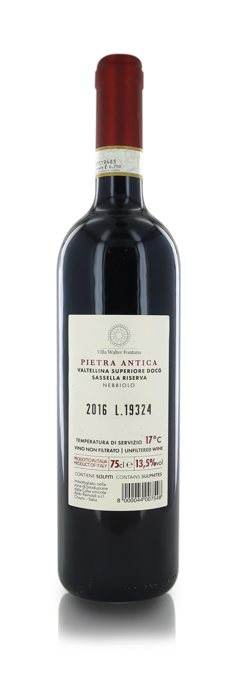 Vino rosso valtellinese "Pietra Antica" del marchio "Villa Walter Fontana". Bottiglia da 750 ml. Si tratta di un Sassella Riserva Valtellina Superiore DOCG realizzato con varietà d'uva "Nebbiolo" (Chiavennasca). Rientra nel gruppo dei vini rossi fermi. Vanta una gradazione alcolica di 13,5% e un colore rosso rubino intenso. All'olfatto, si percepisce un bouquet complesso di profumi caratterizzato da sentori di fiori rossi e confettura. Al palato, il sapore è pieno, rotondo e armonico.