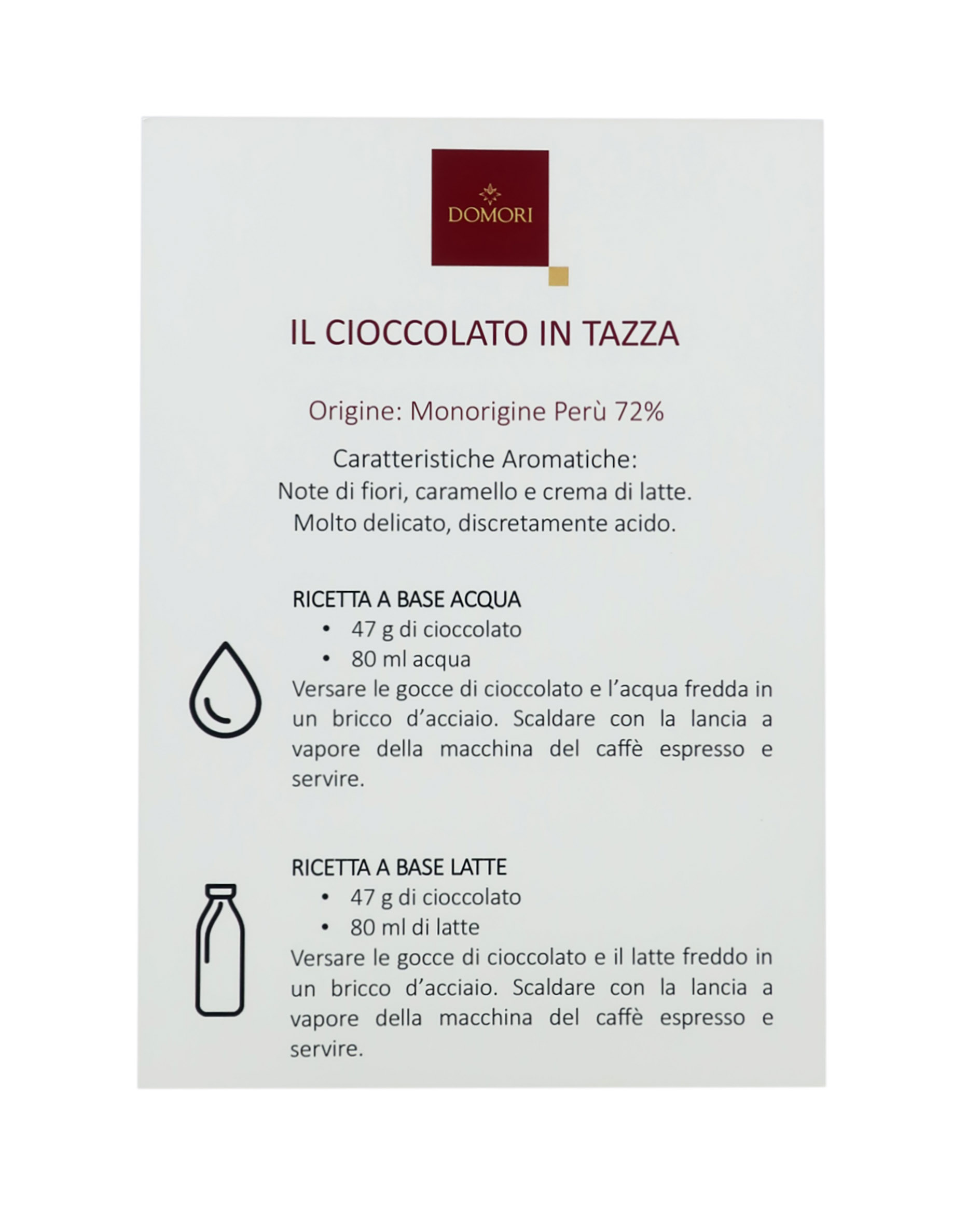 Preparato privo di cacao in polvere, aromi o addensanti, per realizzare una buonissima cioccolata calda in modo semplice e veloce. Il preparato è in formato "gocce di cioccolato" da far sciogliere in pochi minuti per ottenere cioccolata calda fumante, dal gusto deciso di cacao. Il cacao utilizzato per la creazione di questo preparato per cioccolata calda è della varietà Apurimac (fondente 72%, provenienza: Perù).
