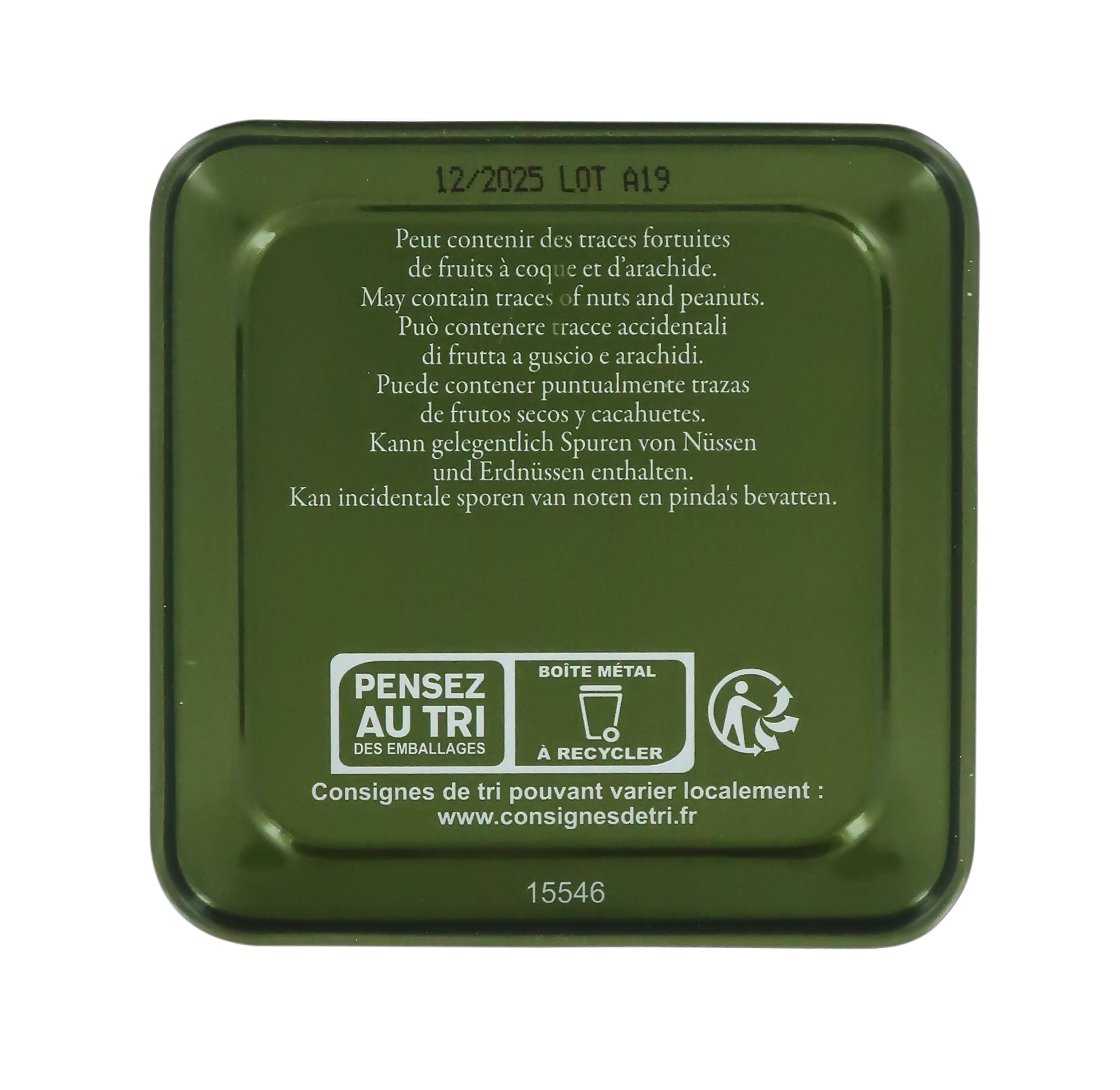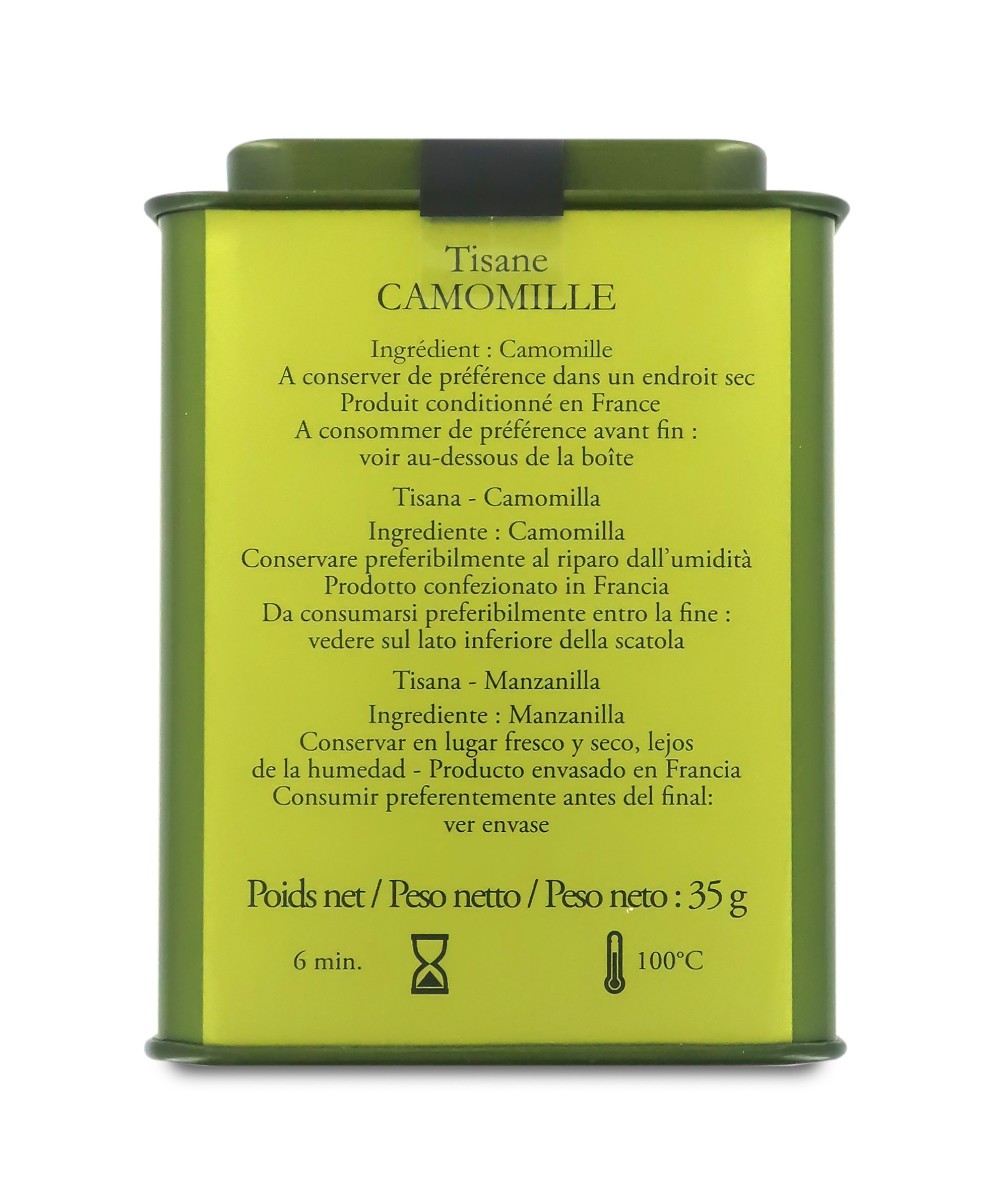 La tisana alla camomilla, in formato sfuso, è contenuta in una elegante scatola di latta.