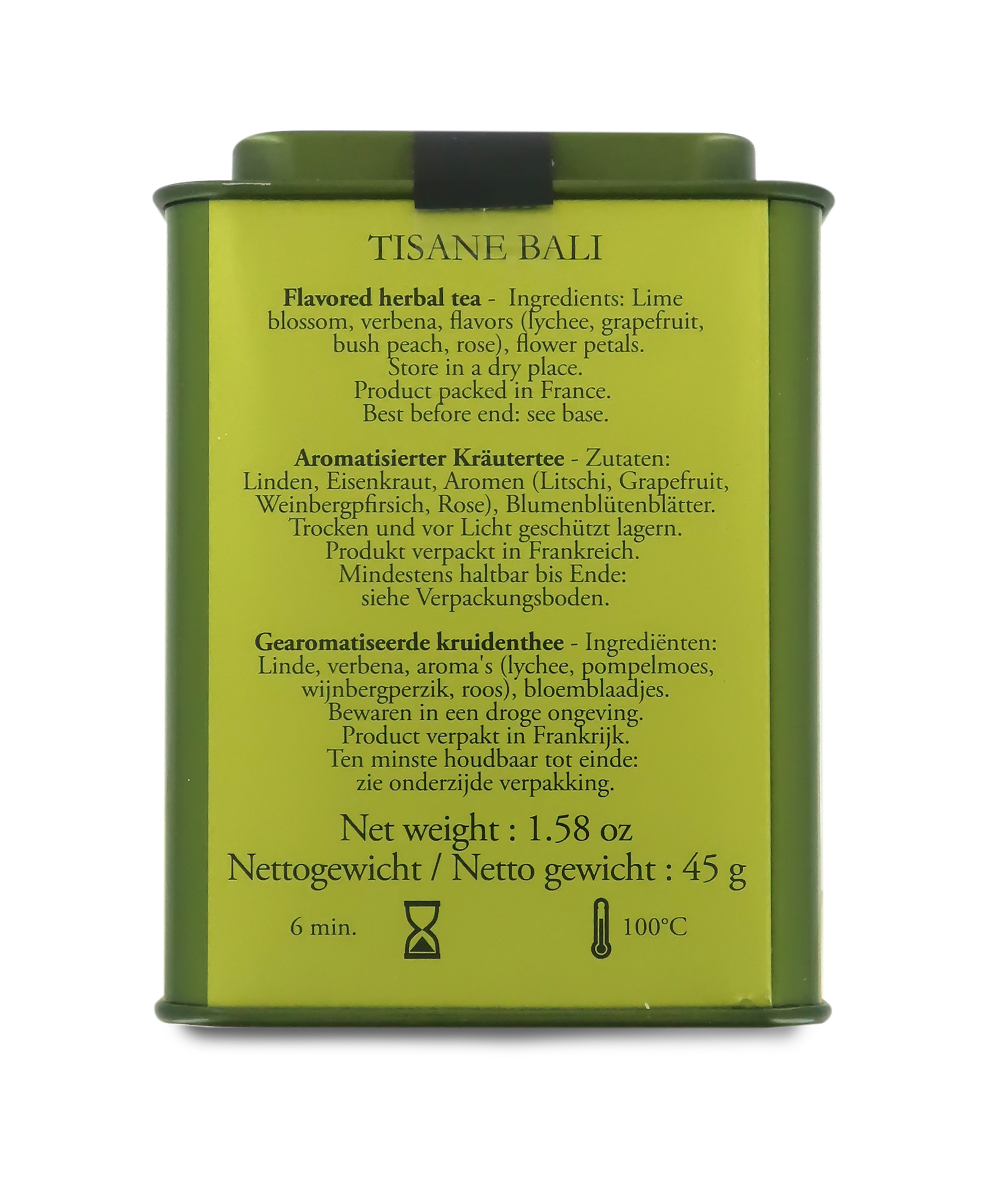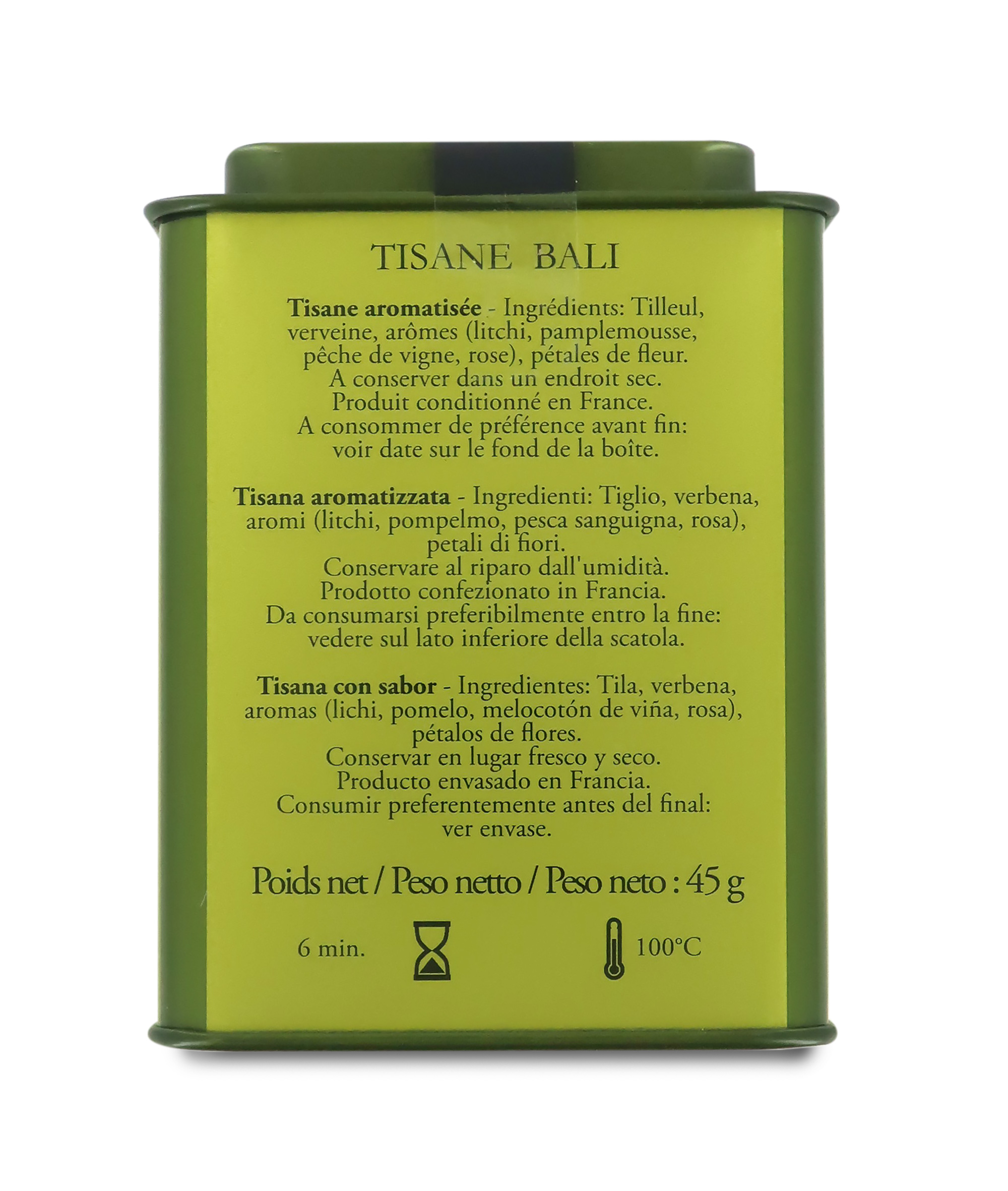 La "Tisane Bali" è una tisana caratterizzata da un equilibrio di note fresche, fiorite e fruttate. Adatto a qualsiasi periodo dell'anno e ottimo tanto caldo quanto freddo, questo infuso è realizzato con tiglio, verbena, aroma di litchi (lici), pompelmo, pesca della vigna e rosa.