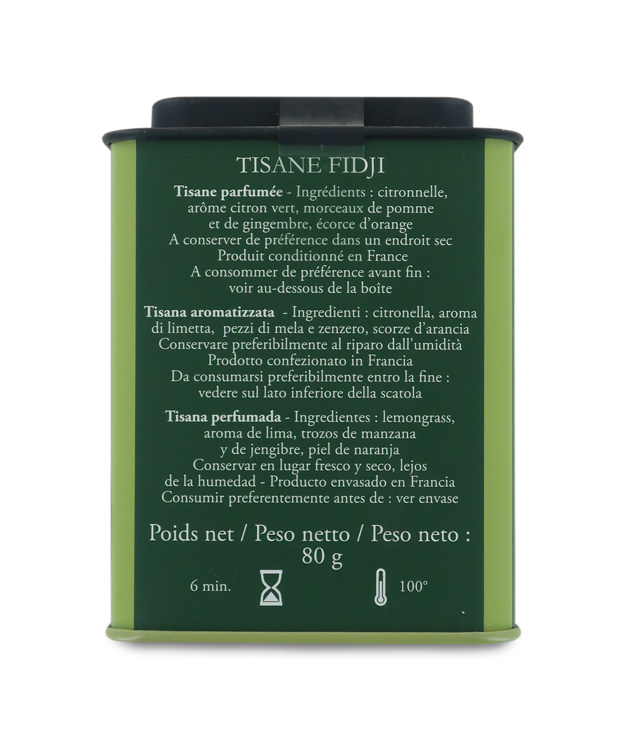 La tisana energizzante "Fidji" al limone, citronella e zenzero di Dammann Frères è contenuta in un'elegantissima scatola di latta, perfetta non solo per conservare il prezioso aroma di questa miscela pregiata, ma anche da regalare.