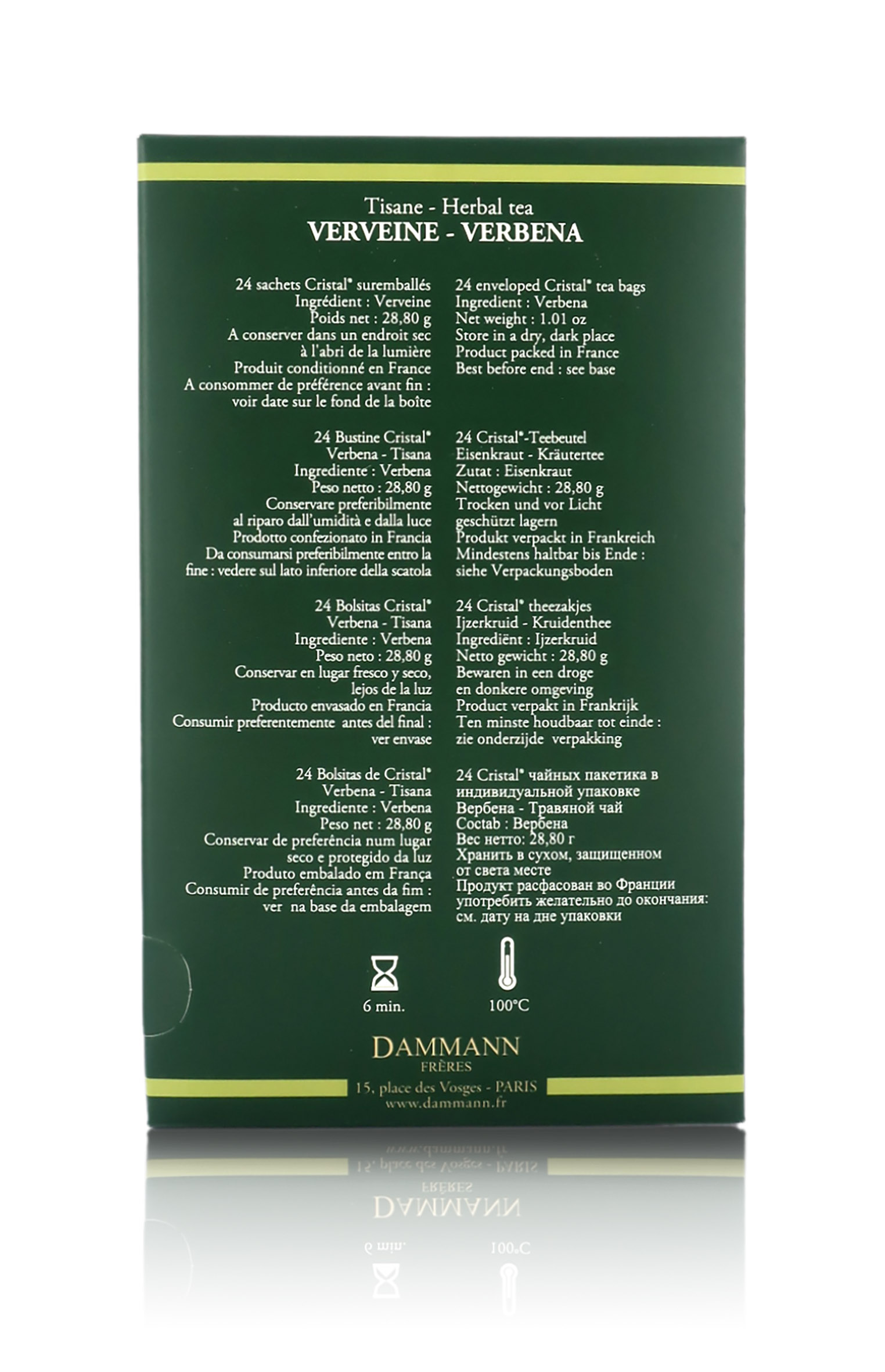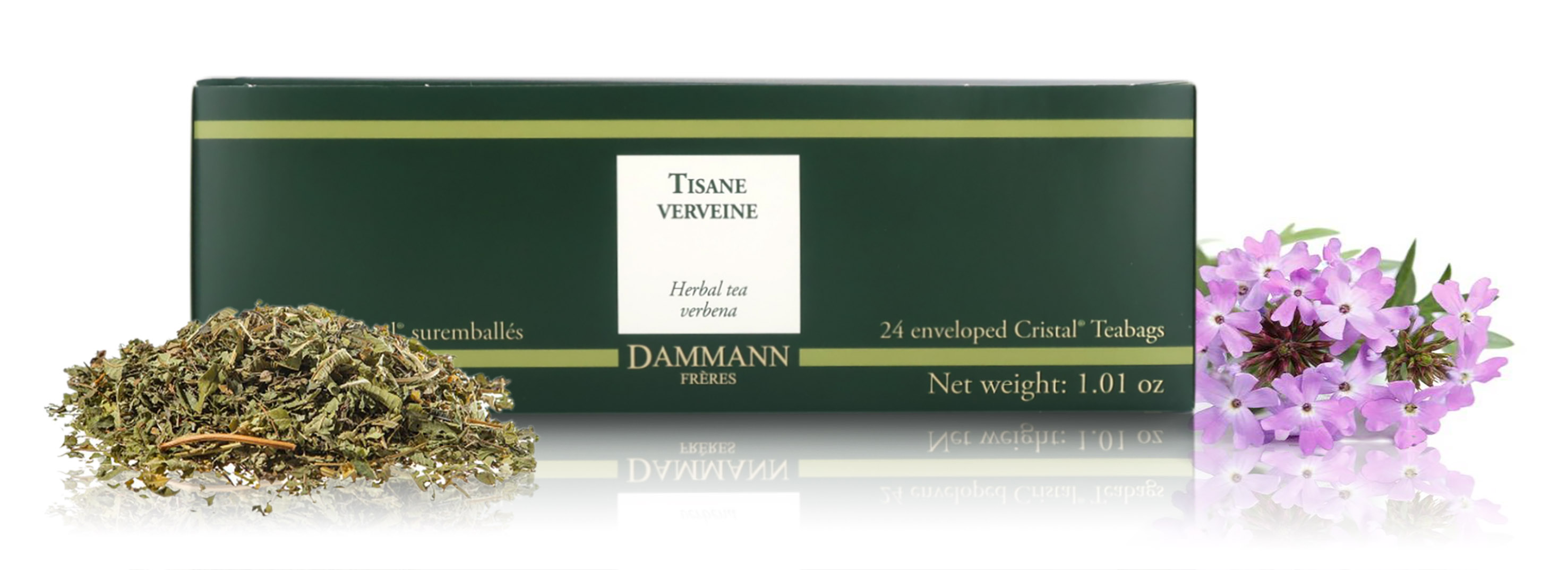 La tisana alla verbena di Dammann Frères è contenuta in esclusive e pratiche bustine "Cristal" incartate singolarmente.