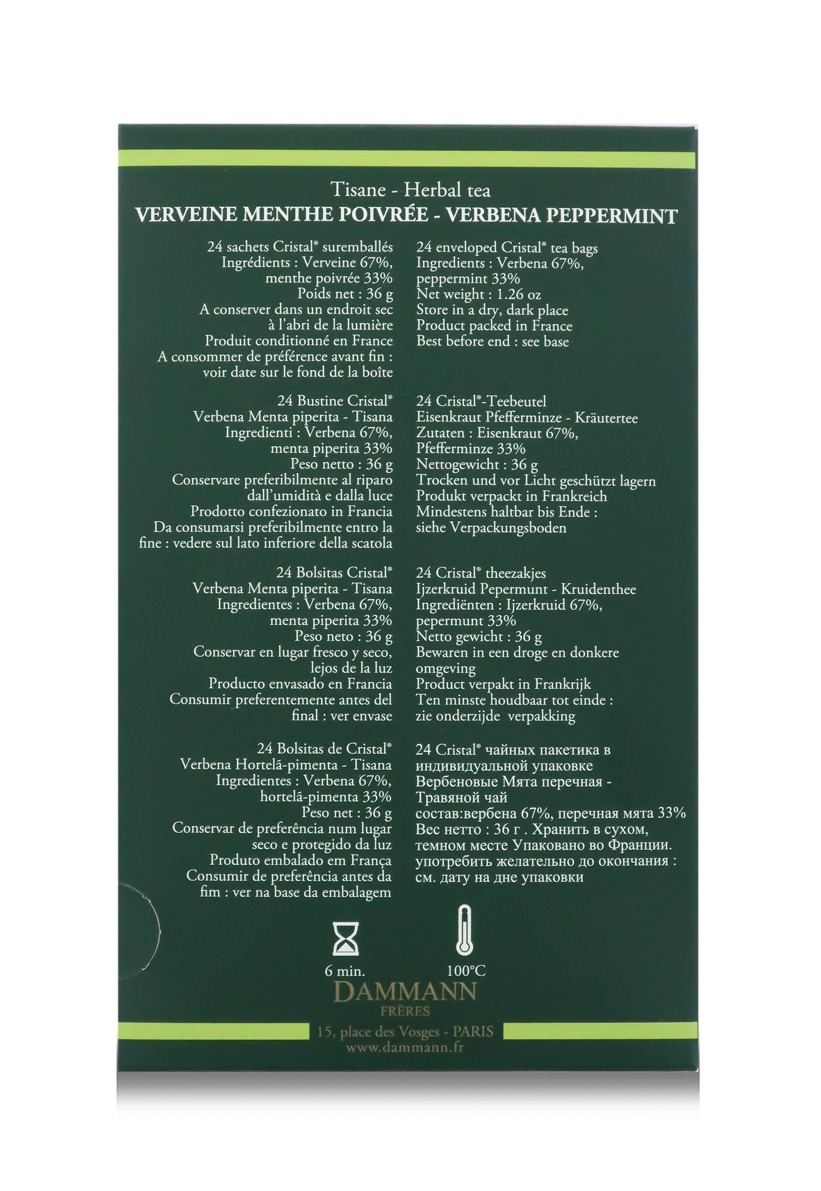 Questa tisana alla menta e verbena di Dammann Frères è contenuta in esclusive e pratiche bustine "Cristal" incartate singolarmente.