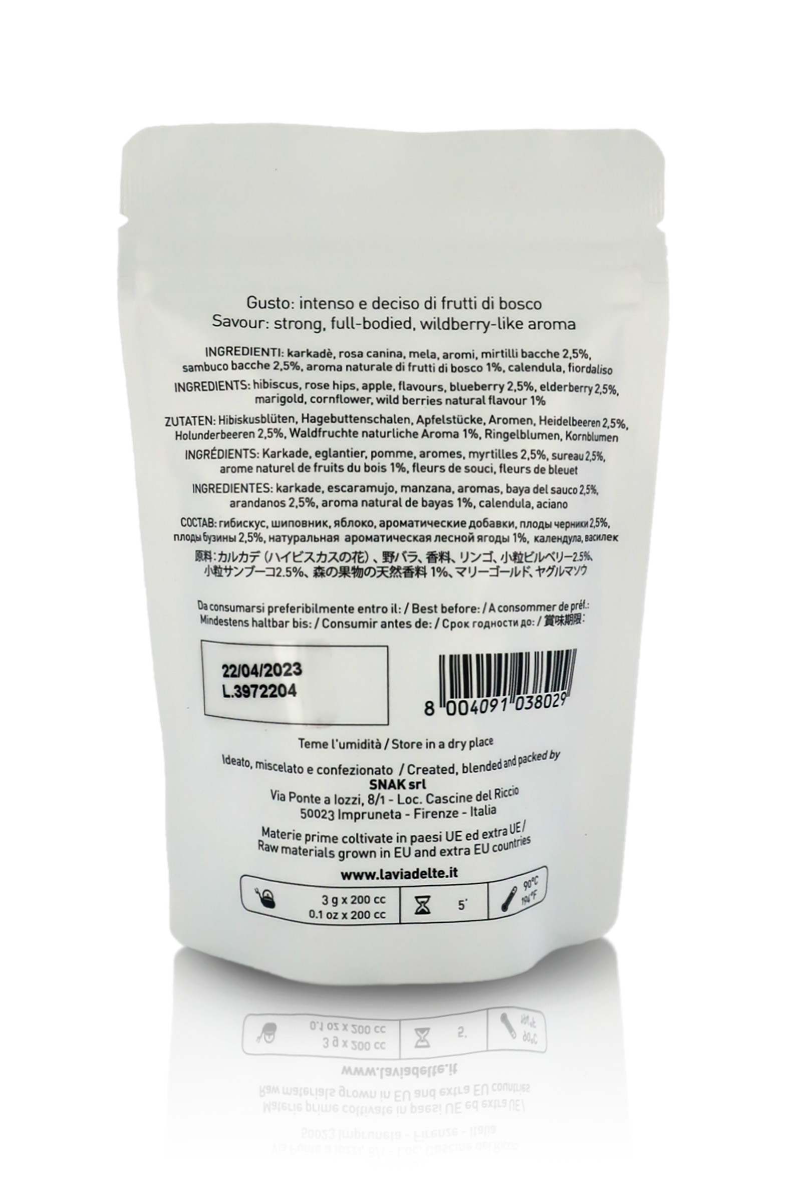 Ingredienti: carcadè, rosa canina 40%, mela, aromi, mirtilli in bacche 2%, sambuco in bacche 2%, ribes rosso 1%, calendula, fiordaliso (petali).