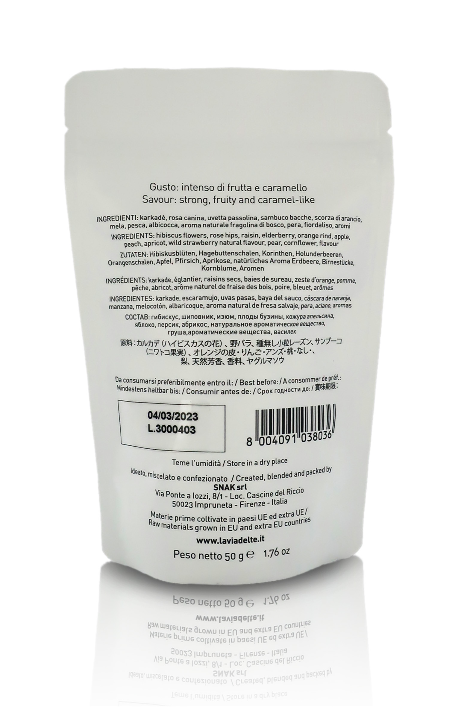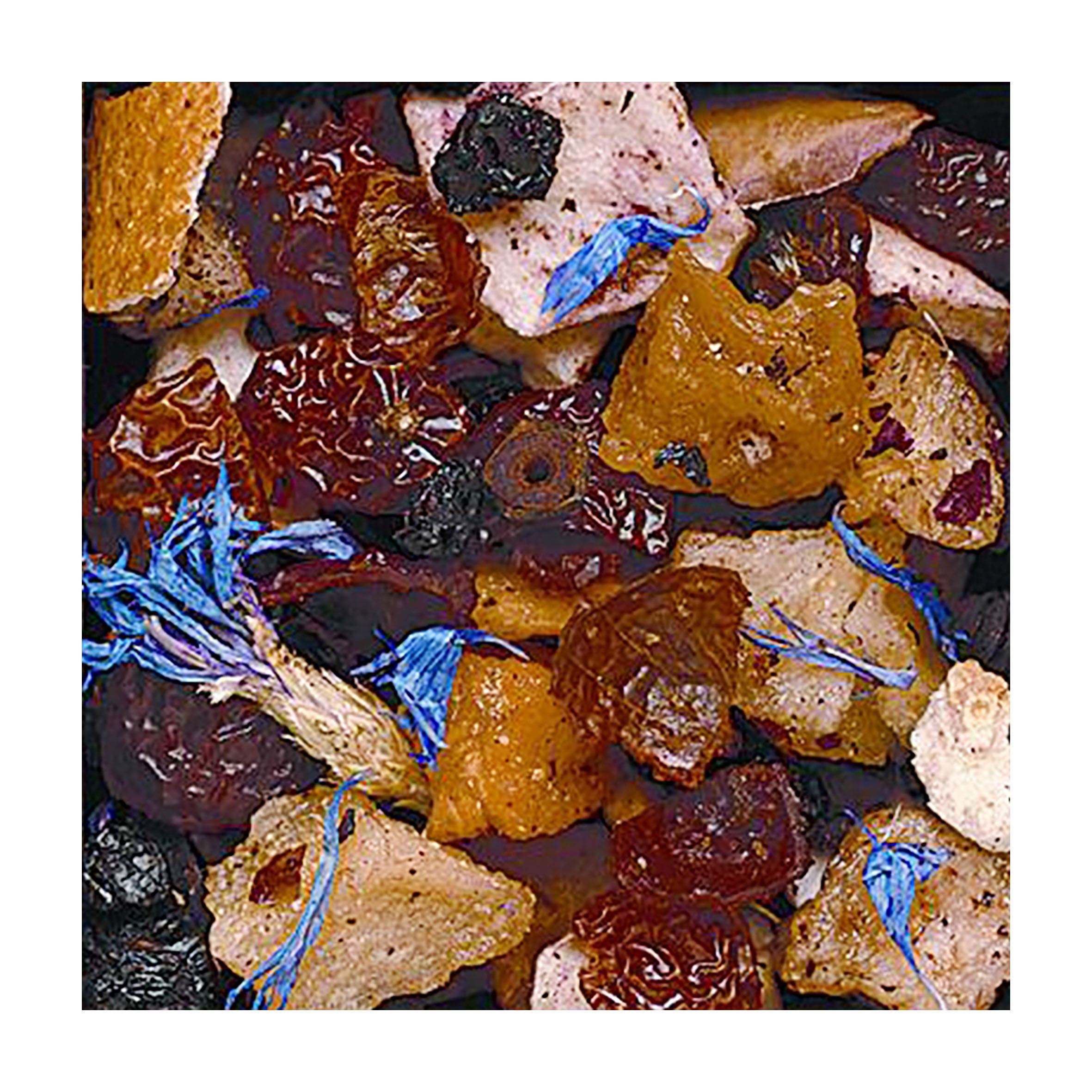 Ingredienti: carcadè, rosa canina, uvetta passolina, sambuco in bacche, scorza di arancio, mela, pesca, albicocca, aroma naturale fragolina di bosco, pera, fiordaliso, aromi.