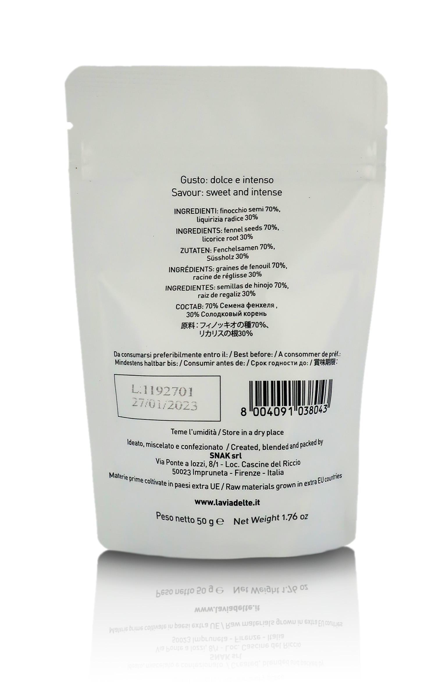 Ingredienti: Finocchio (semi) 70%, liquirizia (radice) 30%.