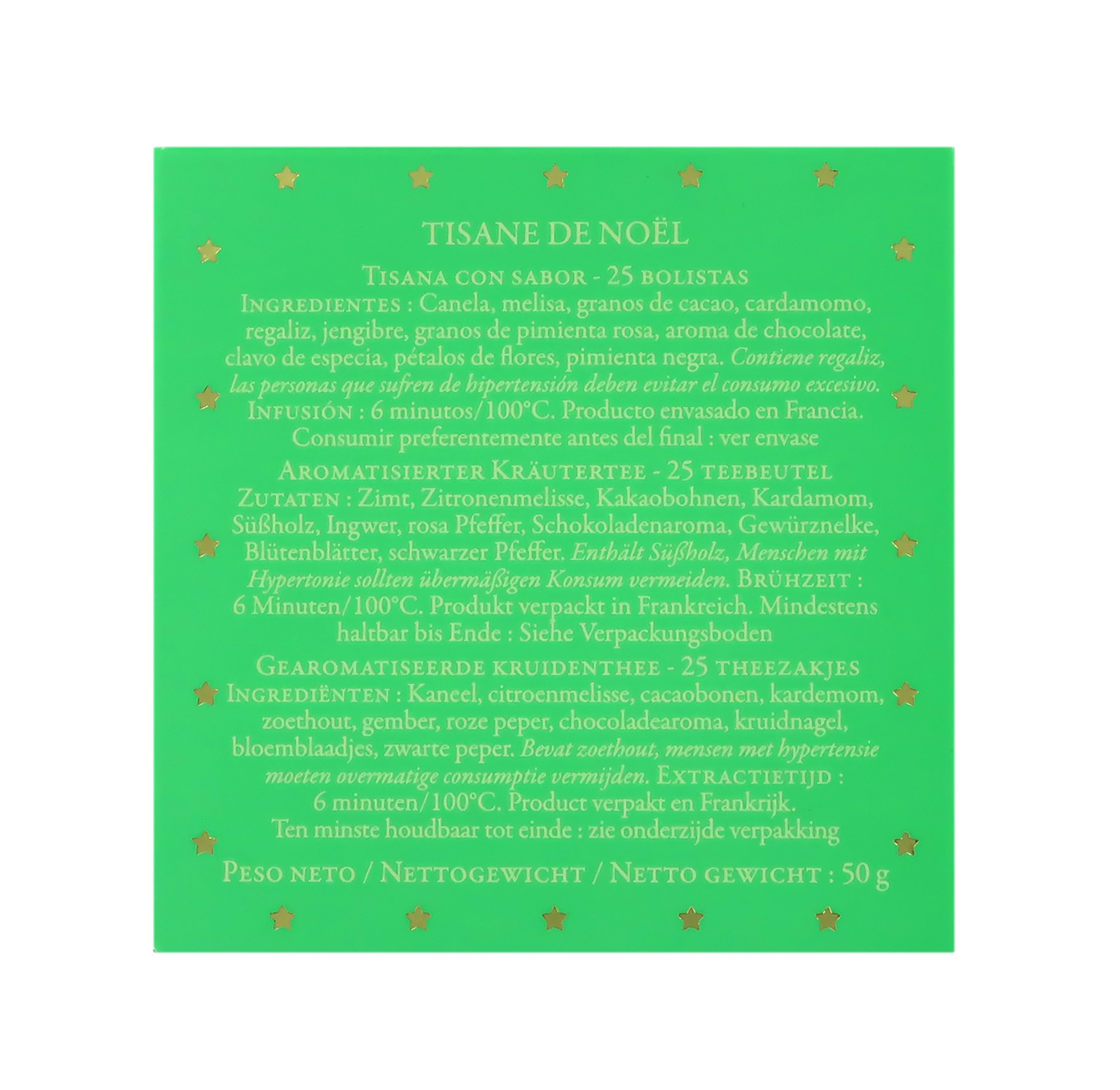 Tisana natalizia con cannella, melissa, fave di cacao, cardamomo, liquirizia, zenzero, bacche rosa, aroma di cioccolato, chiodi di garofano, pepe nero e petali di fiori. Una infusione natalizia molto fruttata, che renderà i vostri pomeriggi delle feste di Natale ancora più speciali! Grazie alla confezione molto natalizia, rappresenta un ottimo regalo per le feste. 25 filtri "Sachet" per un totale di 50g di tè in bustine.