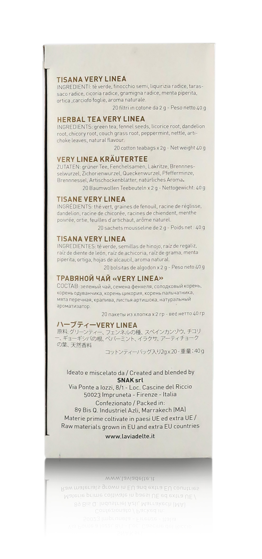 Miscela Very Linea per la preparazione di una buonissima tisana diuretica. La base di tè verde è arricchita da una pletora di erbe dall'indiscusso effetto benefico per la regolarità diuretica. Ideale per depurare ed eliminare i liquidi in eccesso. In astuccio da 20 filtri.