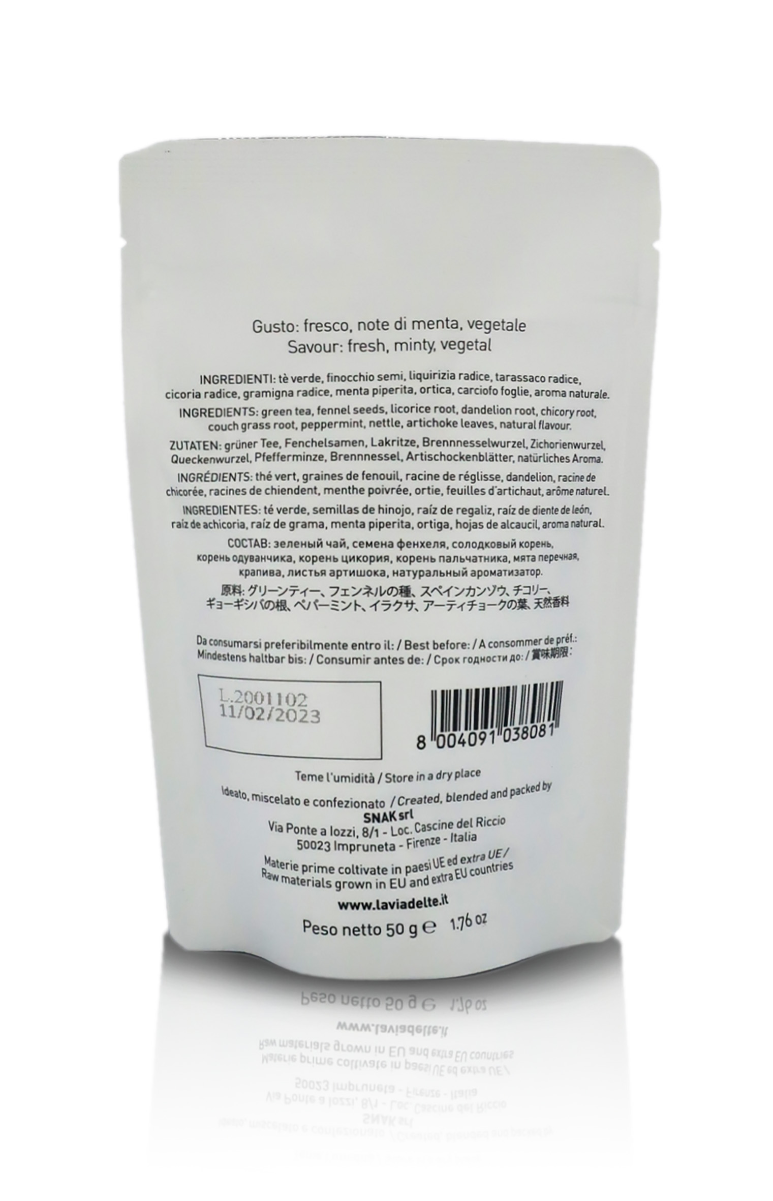 Ingredienti: tè verde, finocchio, liquirizia, tarassaco, cicoria, gramigna, menta piperita, ortica, carciofo e aroma naturale di menta Nanah.