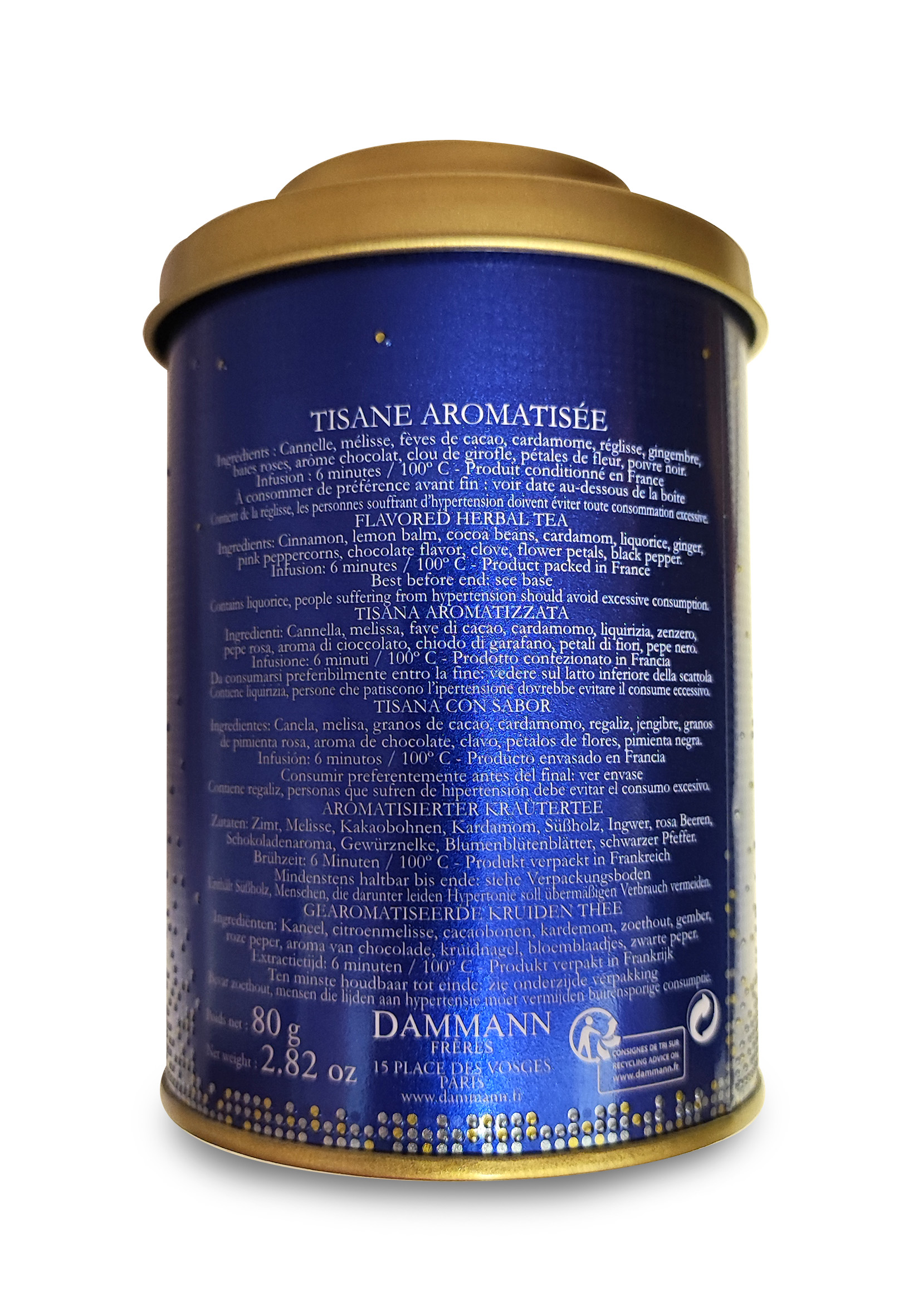 Formato: grazioso barattolo di latta con apertura a lattina (80g) che si distingue per il decoro particolarmente bello e per il colore. Collezionate tutti i barattoli dei vari gusti di tè e miscele natalizie 2020 Dammann Frères!