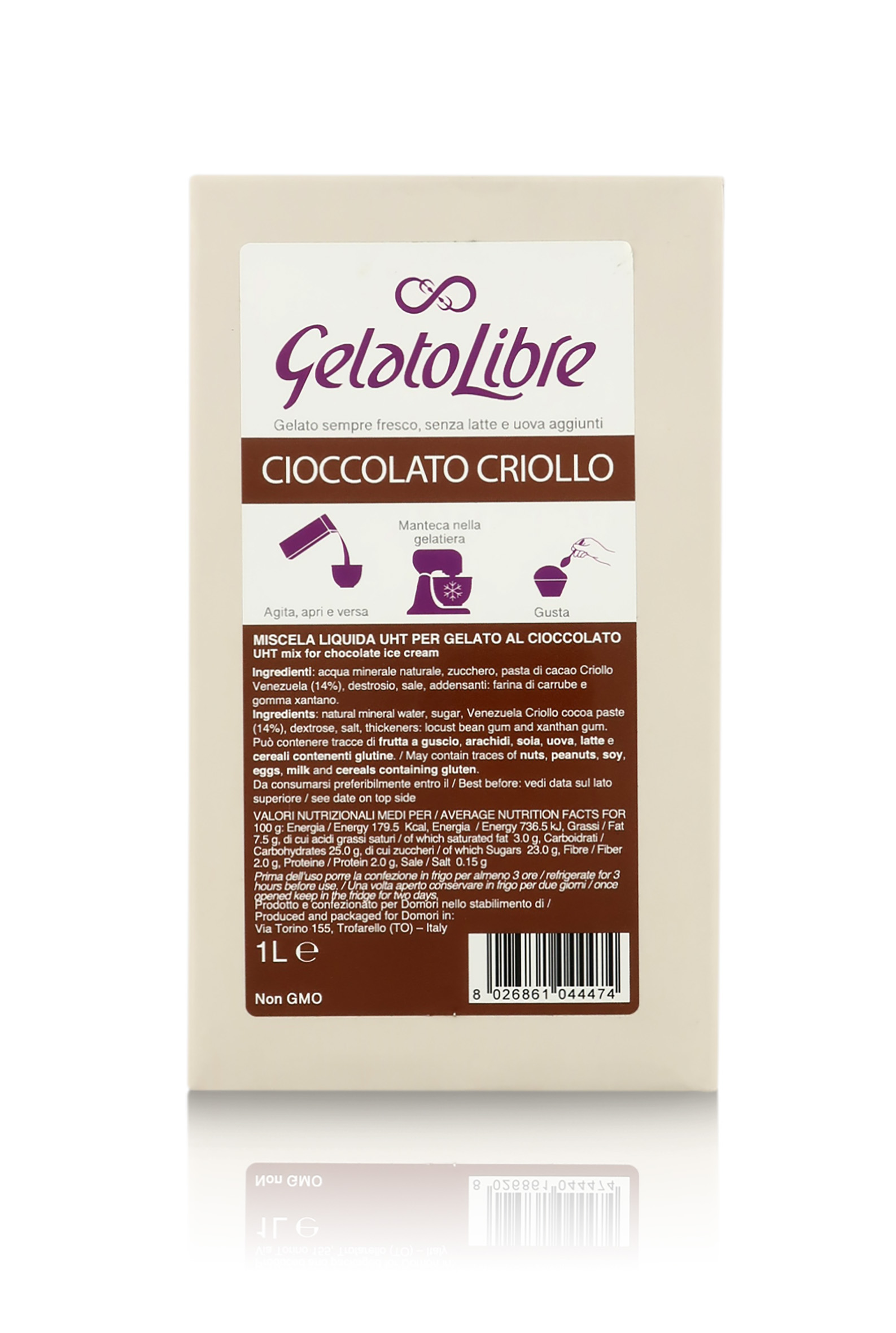 Questa versione di preparato per gelato è al Cioccolato Criollo: una miscela di tre varietà (Porcelana, Chuao e Canoabo) provenienti dai campi venezuelani di proprietà Domori. Aroma inconfondibile di nocciole, panna e miele.
