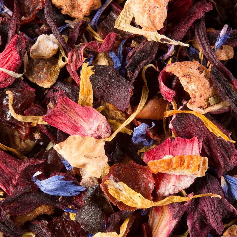 La miscela di tè d'ibisco "Carcadet Samba" racchiude fiori d'ibisco, pezzetti di mela, scorze di rosa canina e arancia, arricchite da dolci note di mango e frutti tropicali.