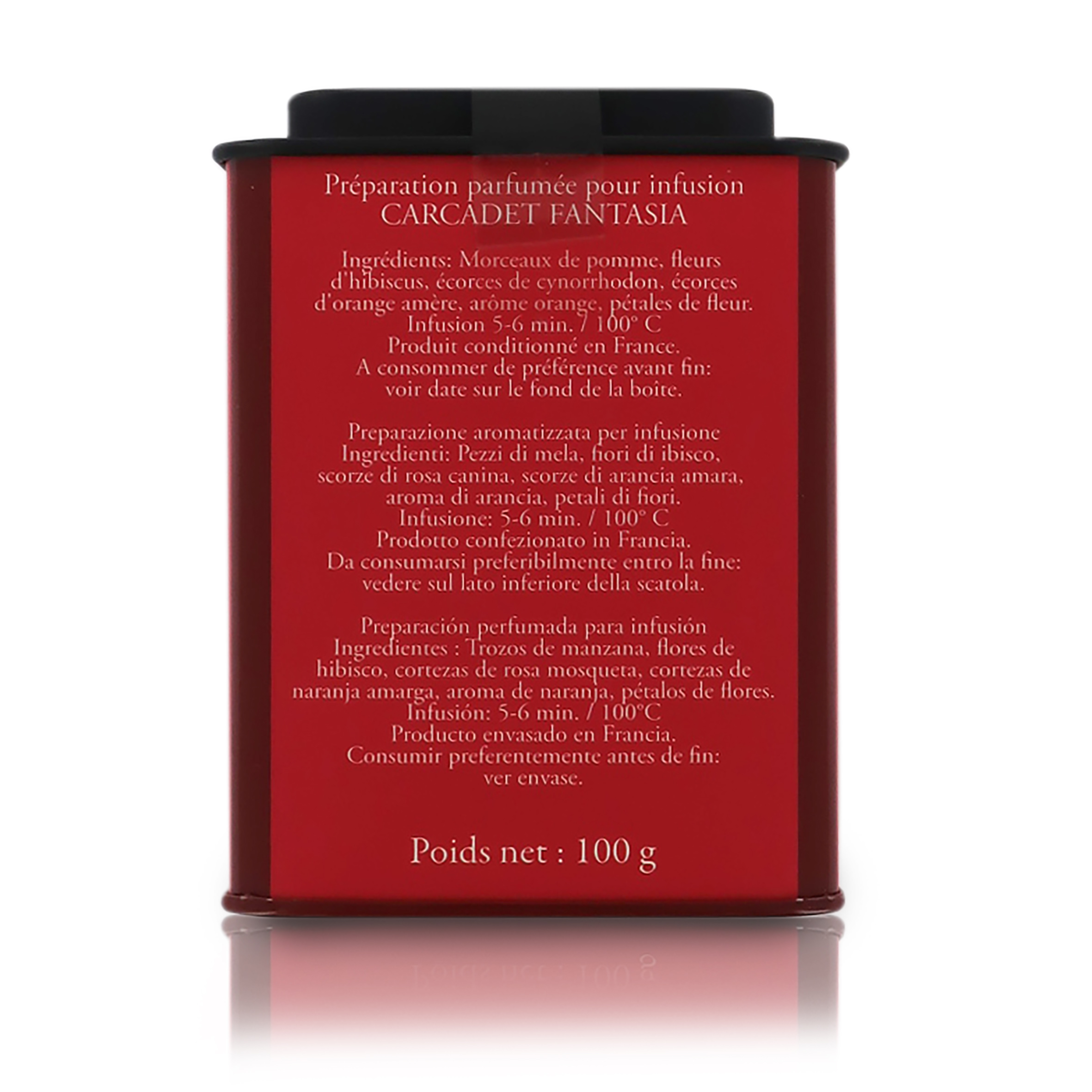 Il carcadè "Carcadet Fantasia" è una miscela di frutta che combina fiori d'ibisco con pezzetti di mela, scorze di arancia e rosa canina, tutte deliziosamente profumate con aromi di arancia rossa. Per un carcadè dissetante, dalla nota principale di agrumi.