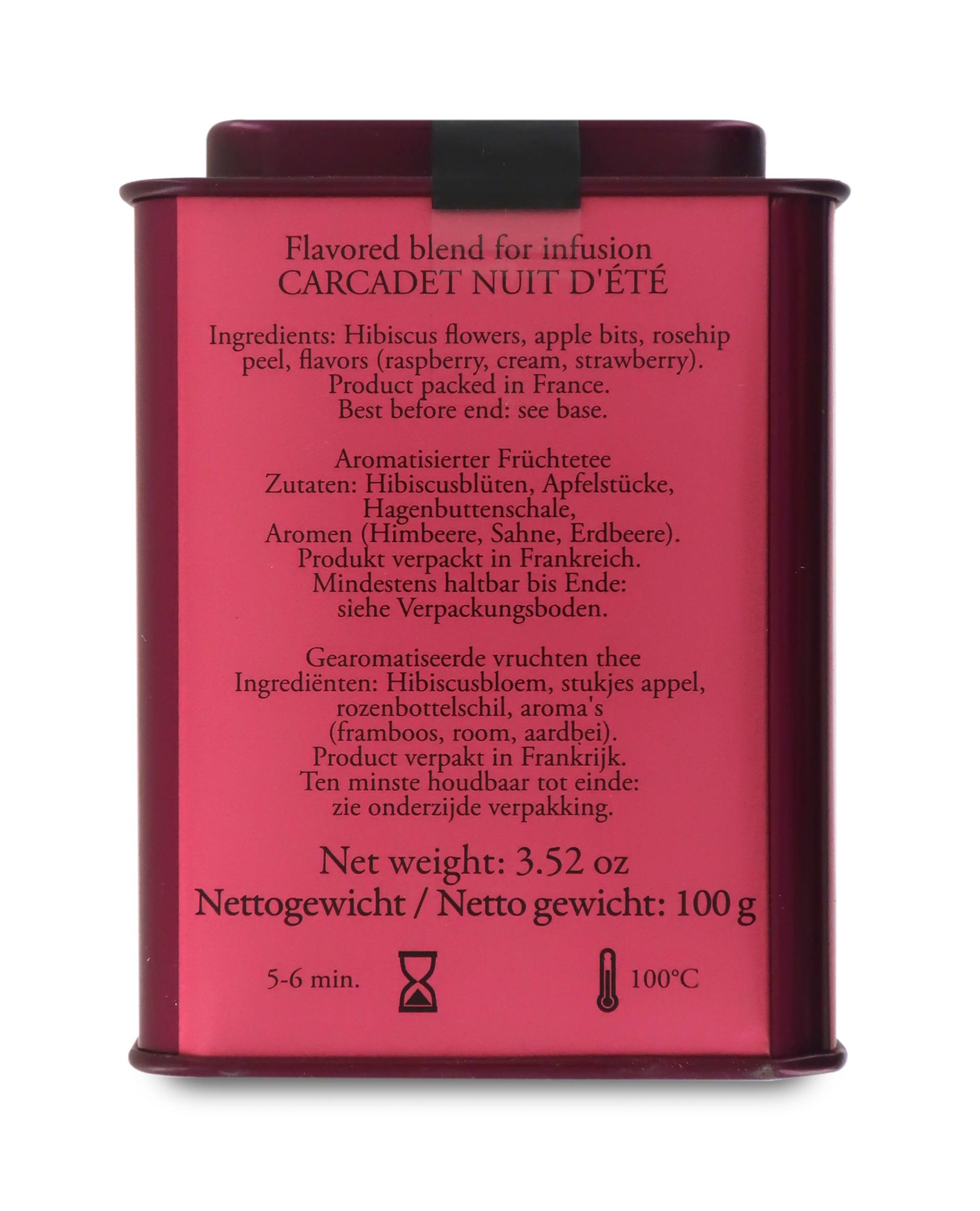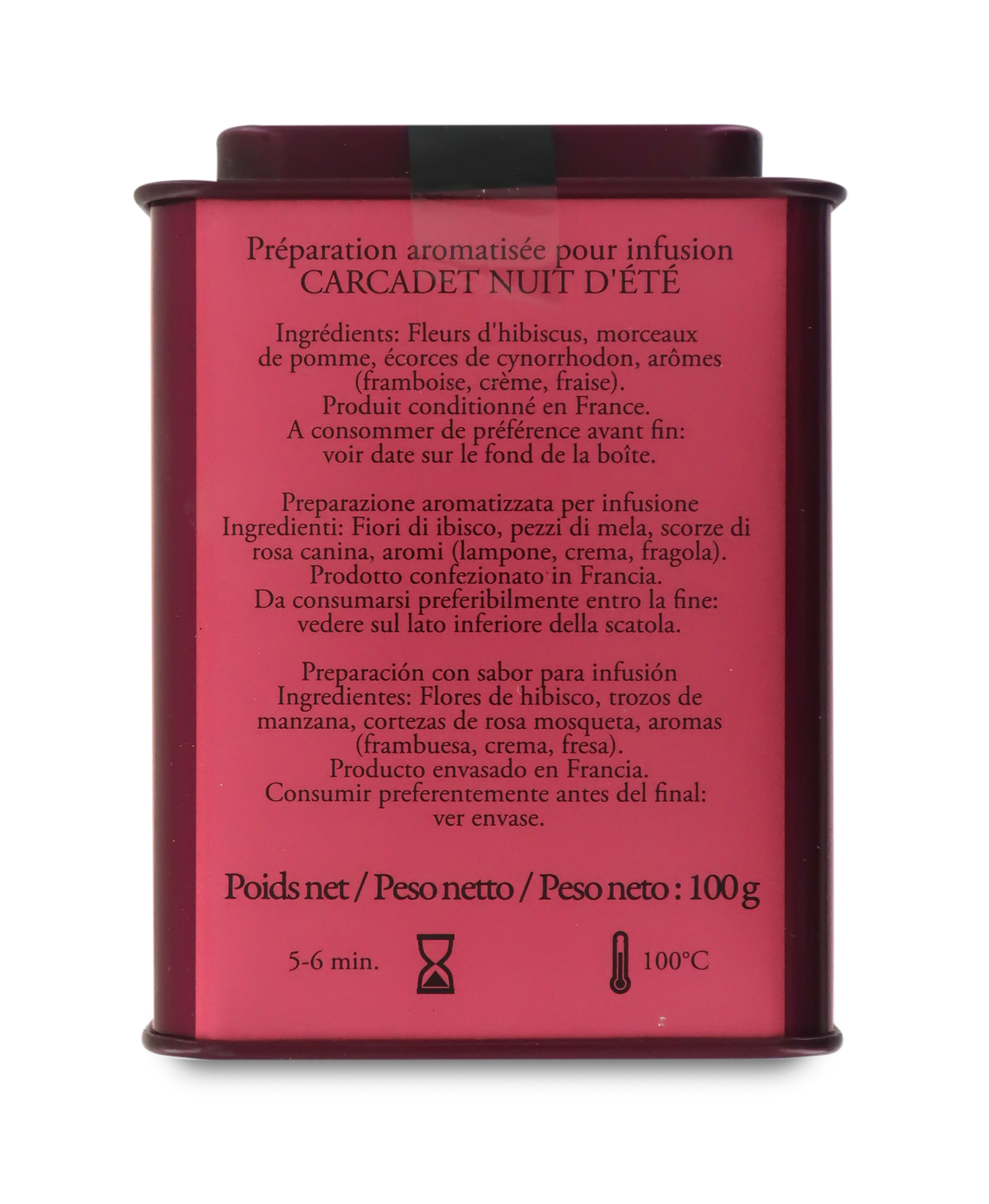 Il carcadè "Carcadet Nuit d'Été", ispirandosi ai profumi di una notte estiva, si compone di una miscela di fiori d'ibisco, pezzi di mela, scorze di rosa canina, aromi di lampone, crema e fragola. Ottimo da bere caldo o anche come tè freddo nelle giornate più calde.