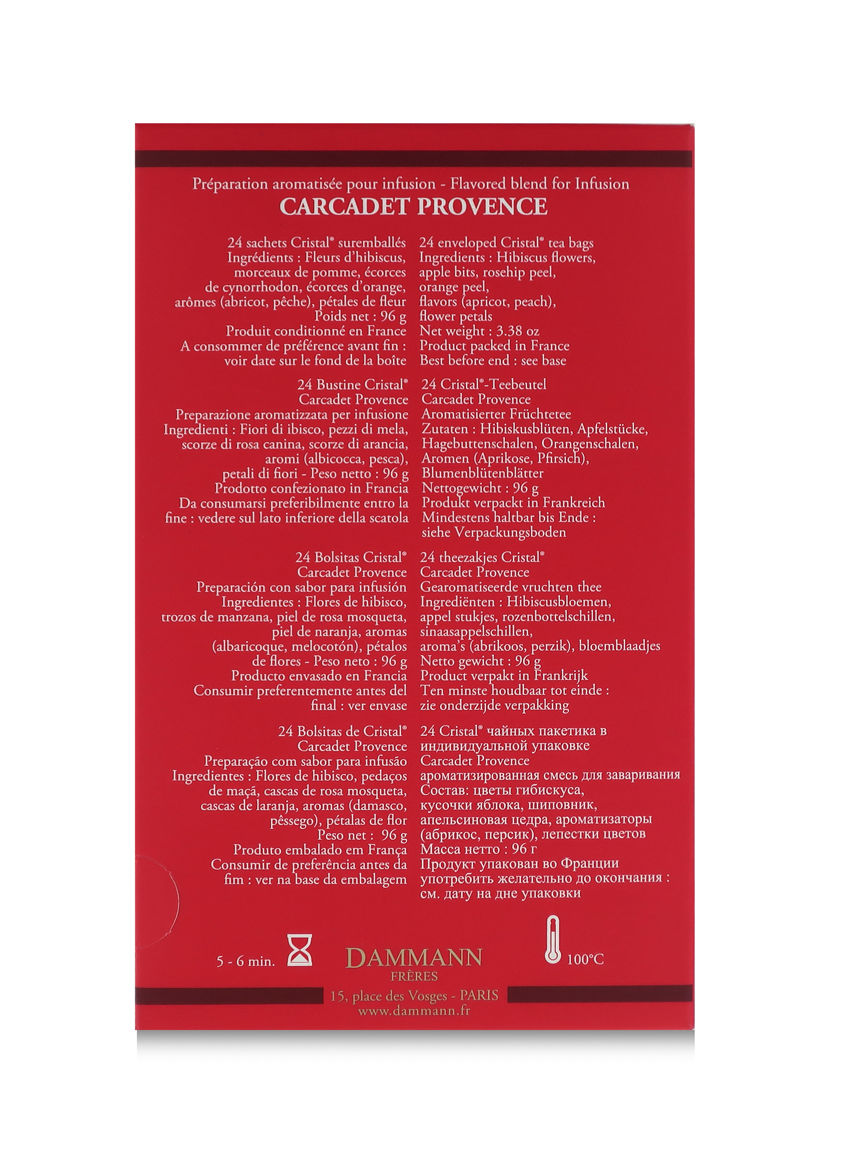 "Carcadet Provence" è una miscela per infuso ai fiori di ibisco, pezzetti di mela, scorze di rosa canina e arancia, arricchito con fiori di elianto. Sorso dopo sorso, si apprezzano anche vivaci note di albicocca e pesca.
